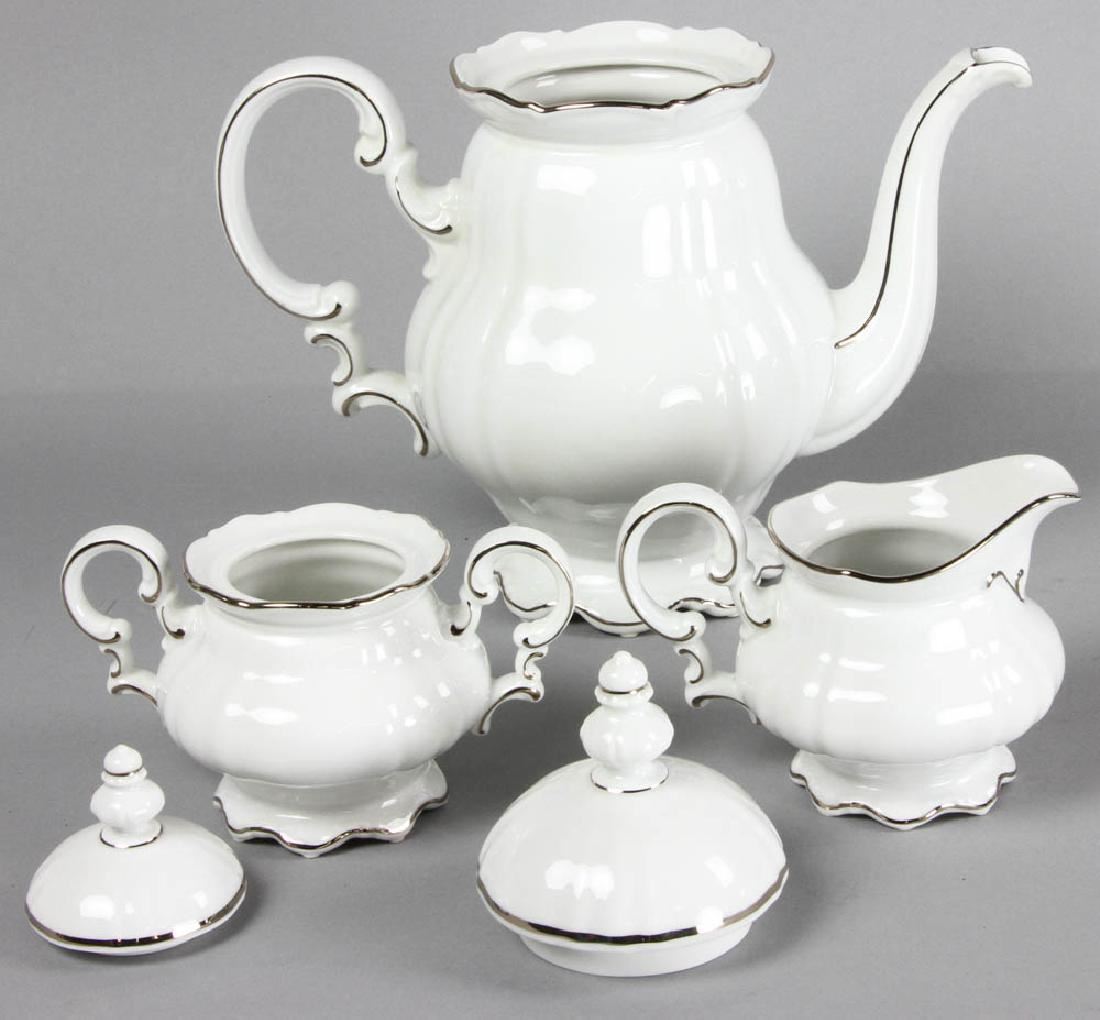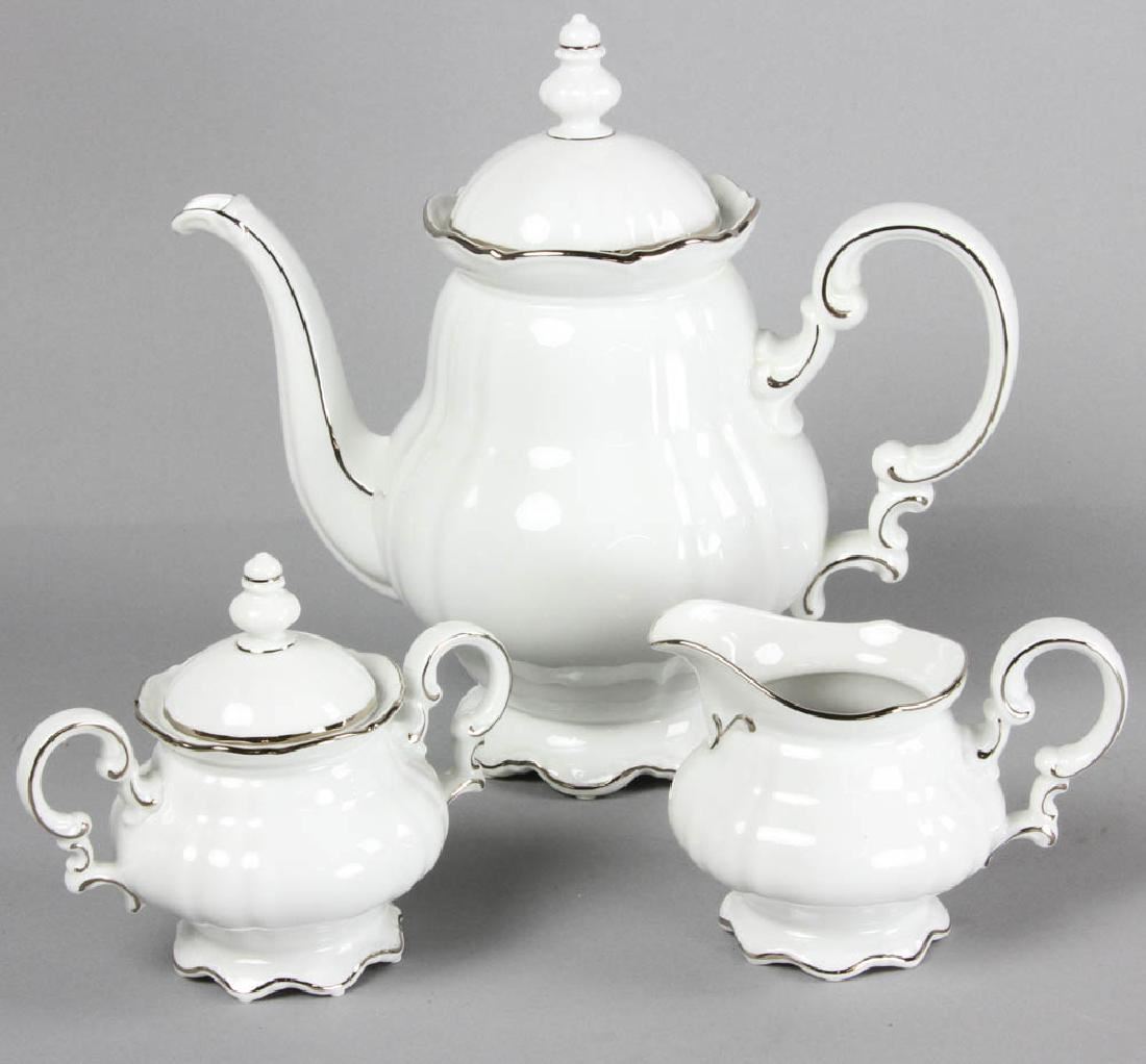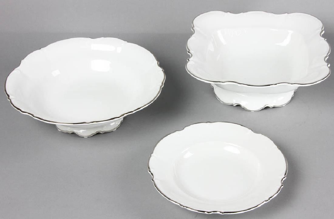 Hutschenreuther china, Lorenz pattern, white ground with silver edge, dinner service for sixteen (16) plus extras and serving pieces, to include: dinner plates, side plates, soup bowls, cups and saucers, two platters, two open vegetable dishes, covered vegetable, teapot, gravy/sauce dish with under tray, cream and sugar, dinner plate measures 10" in diameter. Provenance: Salem, Massachusetts estate.