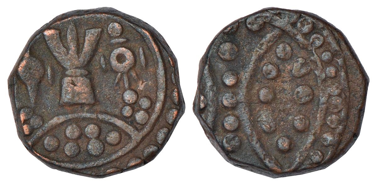 Hyderabad, Feudatories-Shorapur, Bahari, copper paisa, chakra, trisul and shanka, KM C63, 10.02g.