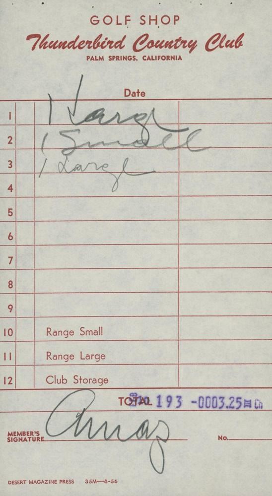 Desi Arnaz signed Thunderbird Country Club Golf Shop receipt