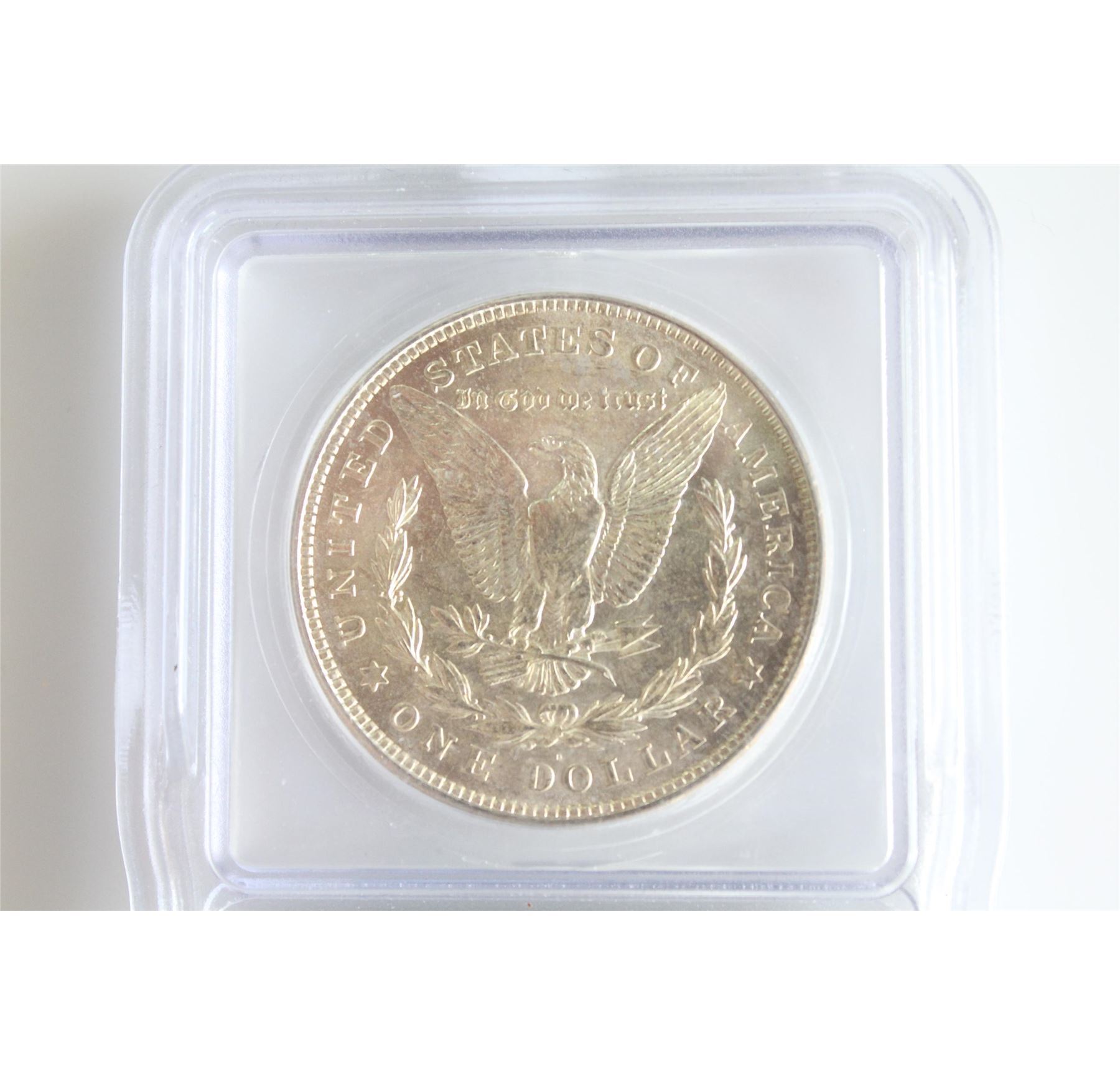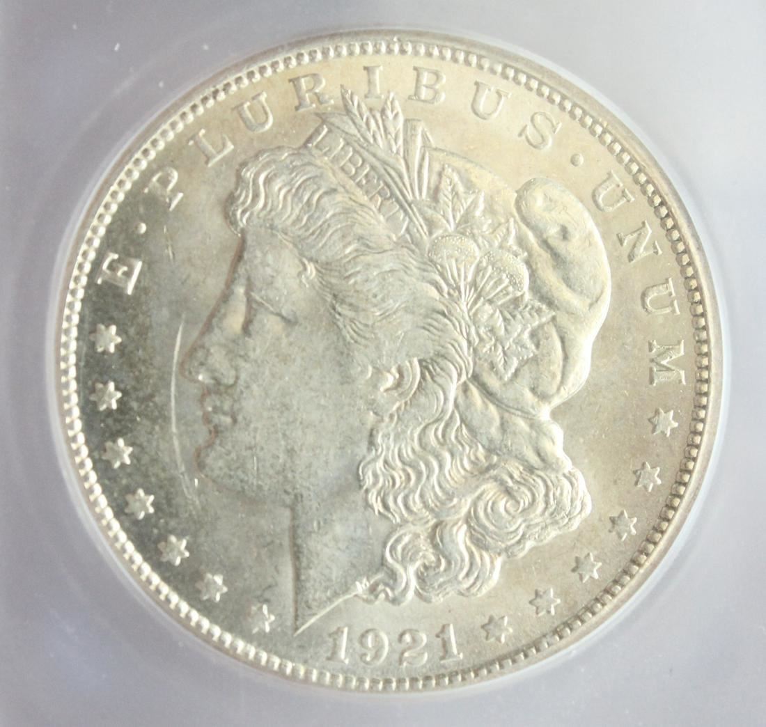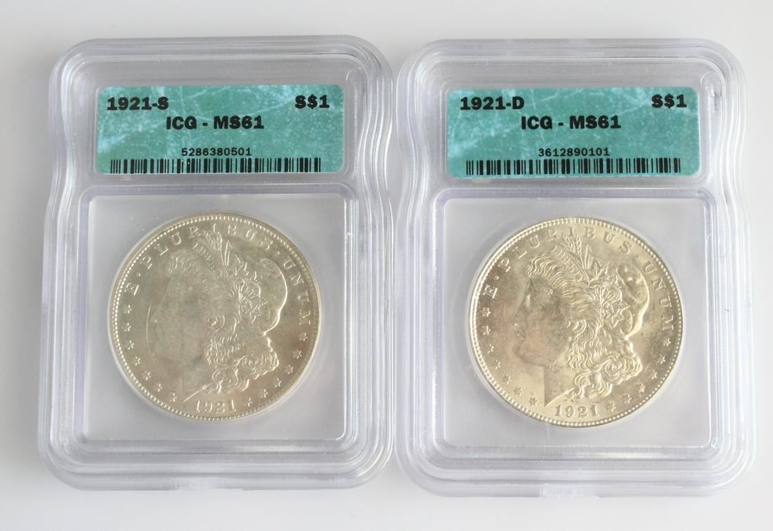 This is a two-coin lot of ICG-graded Morgan Silver Dollars, MS61. 1921-S and 1921-D, nice set.