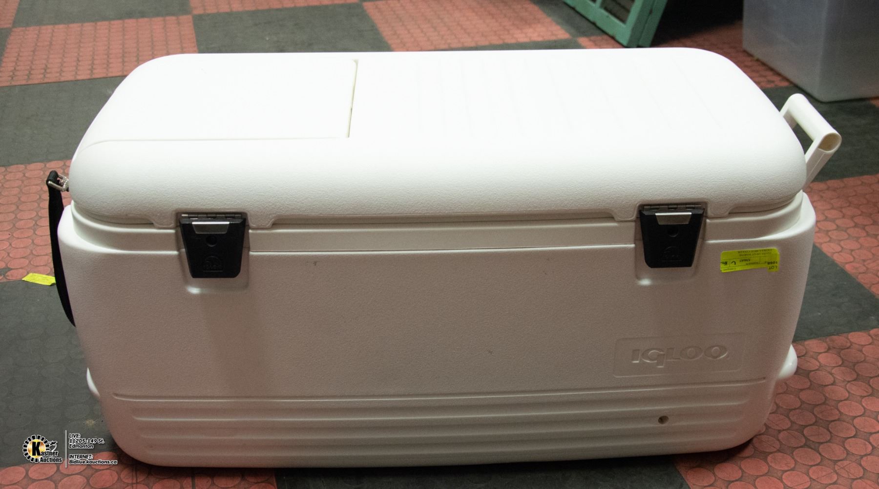 WITH LID IN LID FEATURE, WHITE, DRAIN PLUG (BROKEN HANDLE REPLACED WITH HEAVY DUTY STRAP)