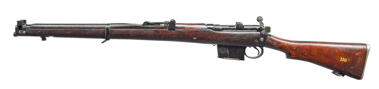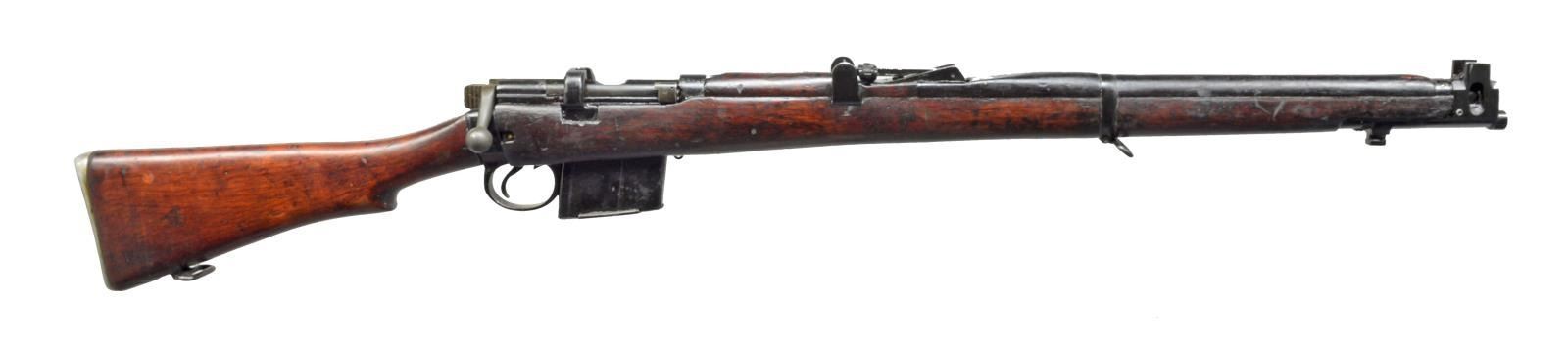 Cal. 7.62x51 (7.62 NATO). S# C6835. Bbl. 25". Import marked on left side of receiver. Butt socket marked on right side w/ “Indian Lions”, “RIFLE”, “7.62mm 2A1”, “RFI” & “1965”. Angled tangent rear sight graduated to 800m. Sight is marked “ICR 1599 RFI”. Blade front sight w/ protective ears. Bayonet lug is present. Bottom swivels. Hardwood stock set. Forend has transverse “Indian Kiss” reinforcing bolt. Buttstock has aluminum trap buttplate. Buttstock marked on right side w/ partially encircled “S/A”, indicating post-independence India. Left side of buttstock has painted white “110” rack number. MAGS: 10 rd. detachable. UNATTACHED ACCESSORIES: 2 boxes of 20 Argentine military 7.62 ball. CONDITION: stock set has moderate wear, dents, staining & scratches throughout. Notable sm. gouges on left side of grip. 75% Original arsenal black finish w/ wear & handling marks. Very good, shiny bore. (20-1997/RW). CURIO. $300-500.