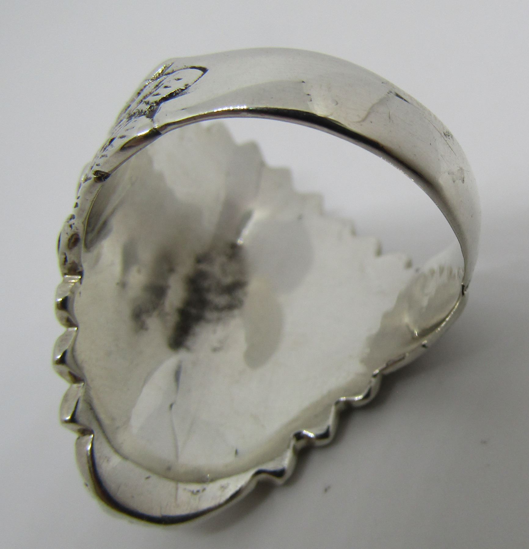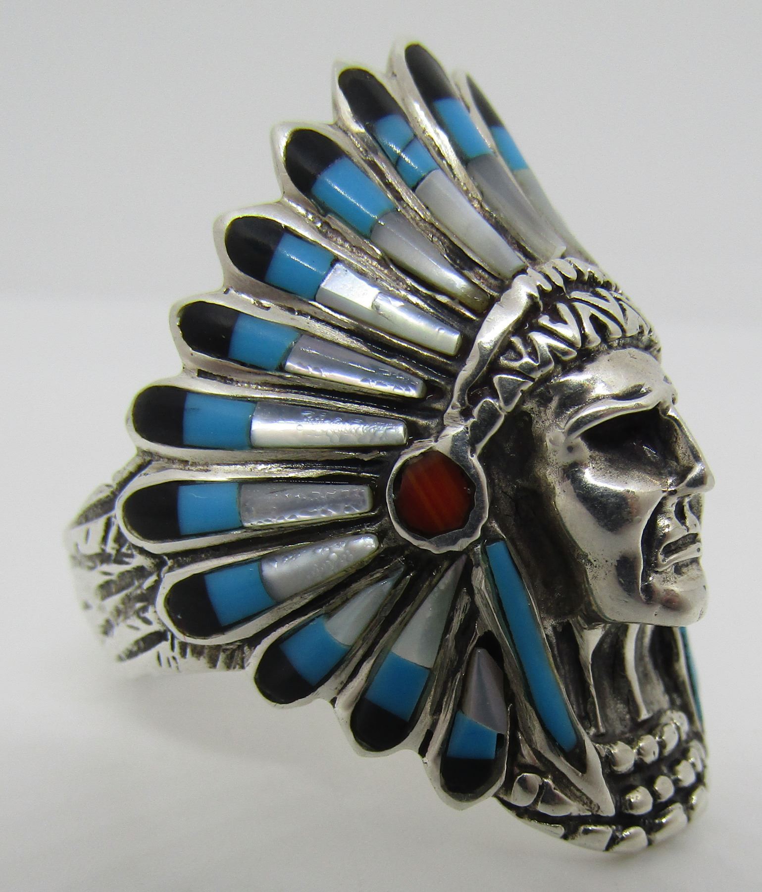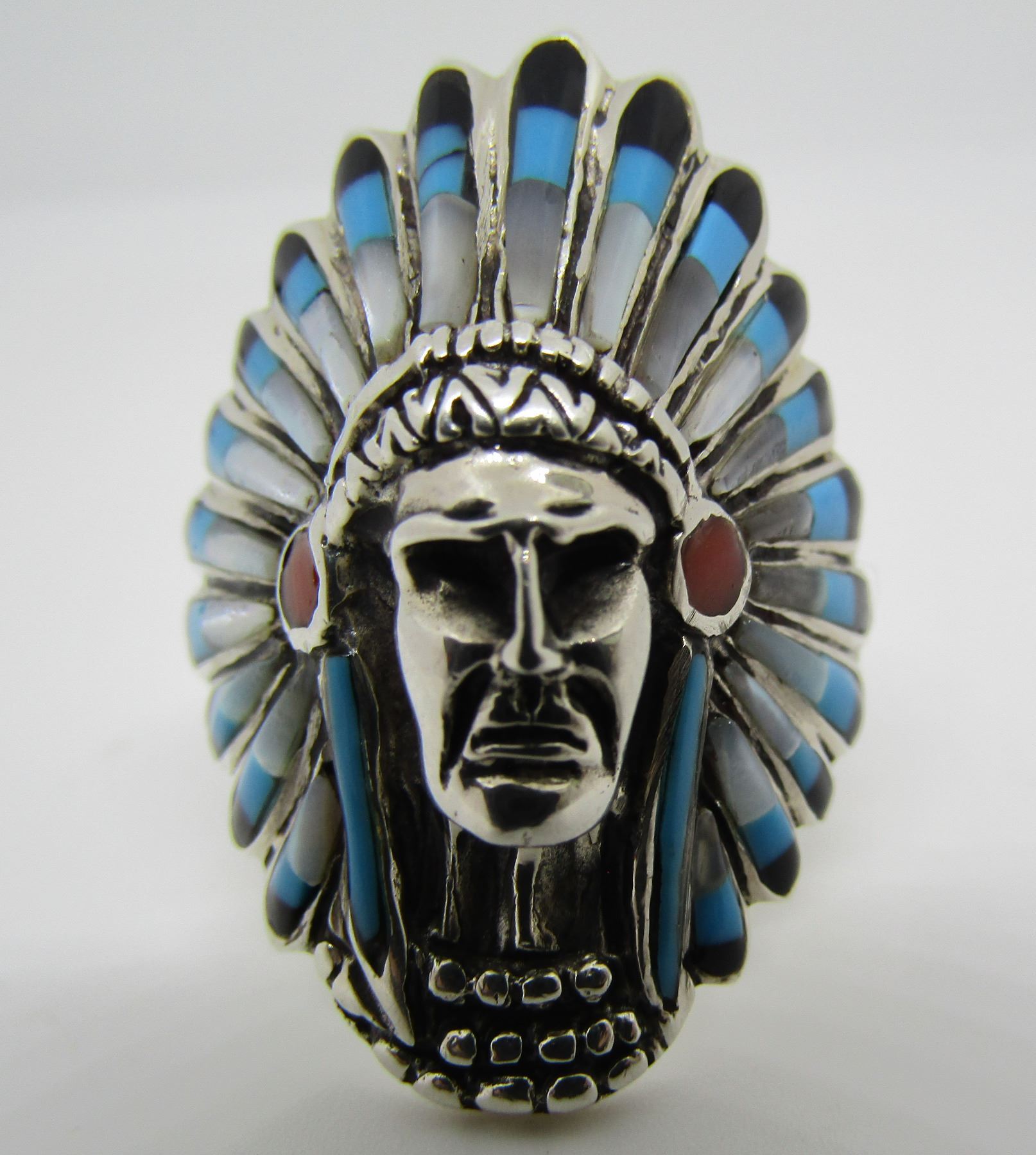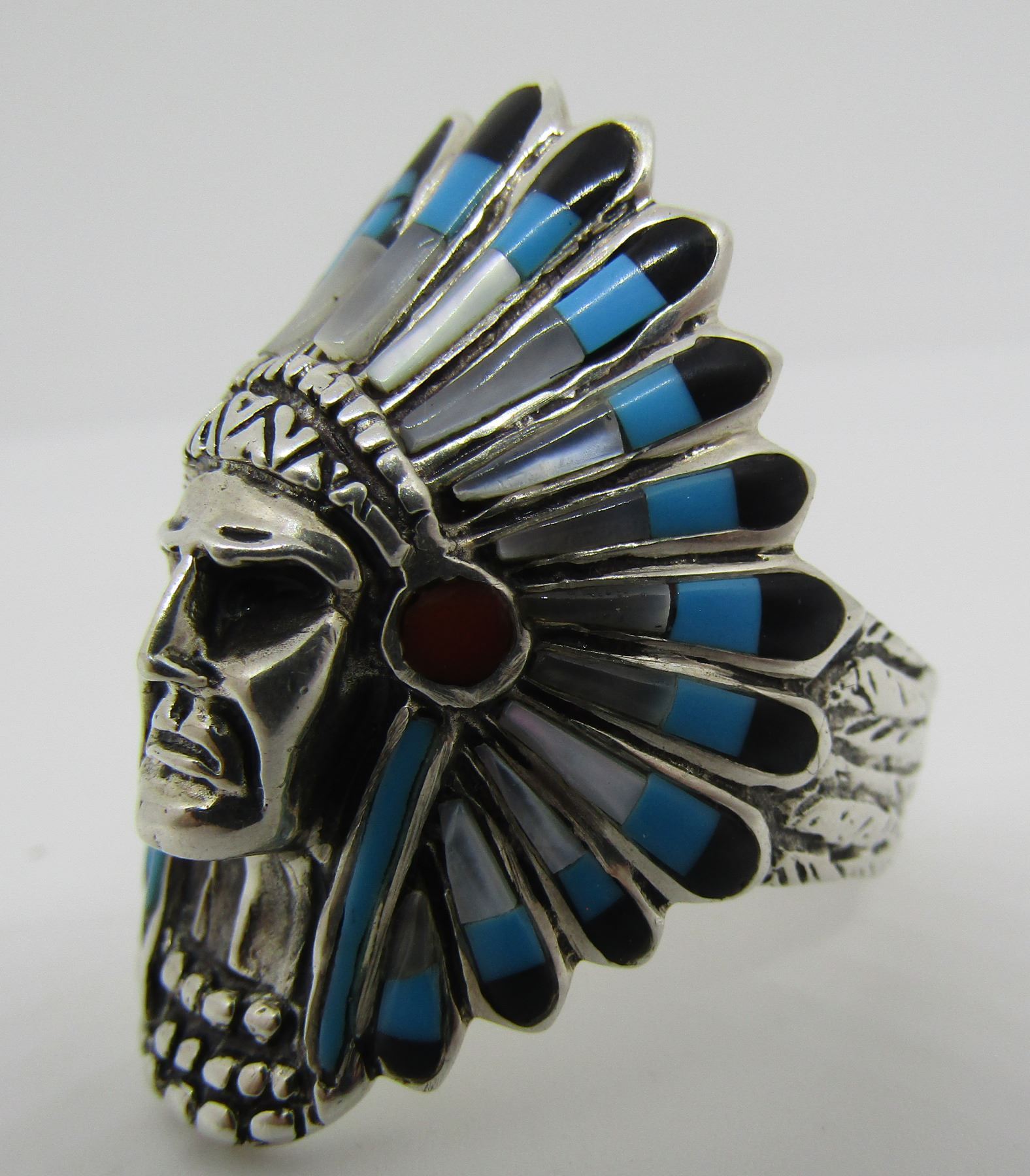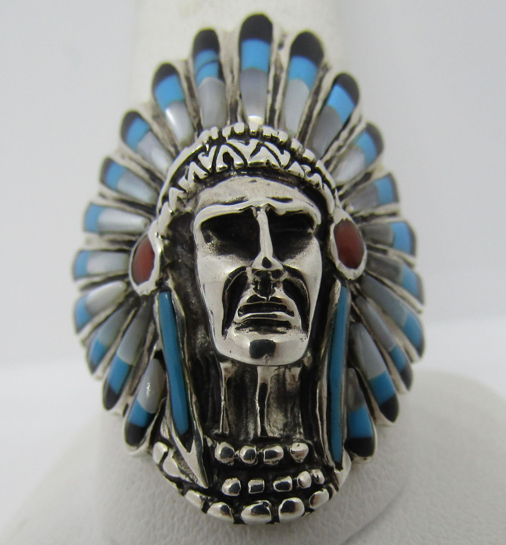 UNMARKED, TESTED STERLING SILVER VINTAGE ESTATE NATIVE AMERICAN SOUTHWEST INDIAN JEWELRY. INLAID WITH 64 STONES: TURQUOISE, MOP, CORAL PLUS OTHERS. TOP MEASURES 32MM WIDE. WEIGHS 14.2 GRAMS. SIZE 12. USASHIPPING $5.