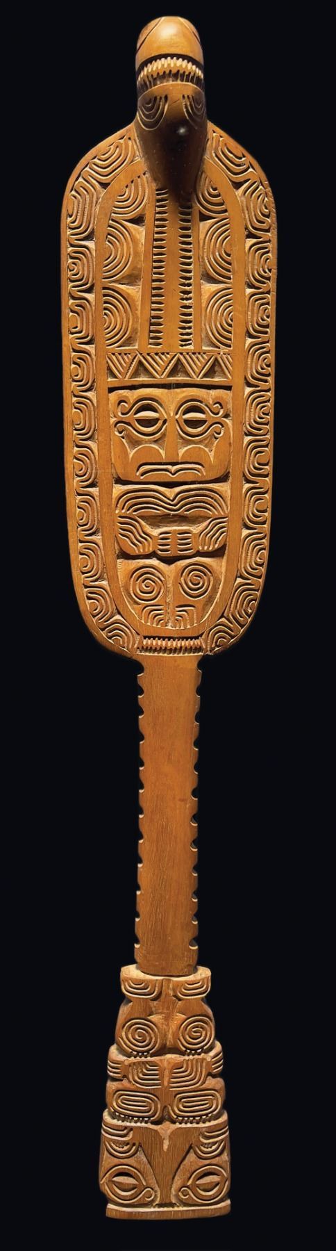 (1960s) An exquisite, fully carved Marquesan war club with exceptional detail. Brought back on The Big Trip by Bob and LeRoy. 23"x4.25". VG+ with typical wear.