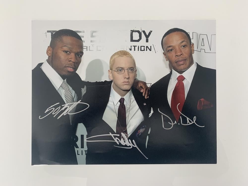 Iconic Rappers photo autographed by Eminem, Dr. Dre, 50 Cent. 8x10 inches. This item is a reprint of an original autograph.