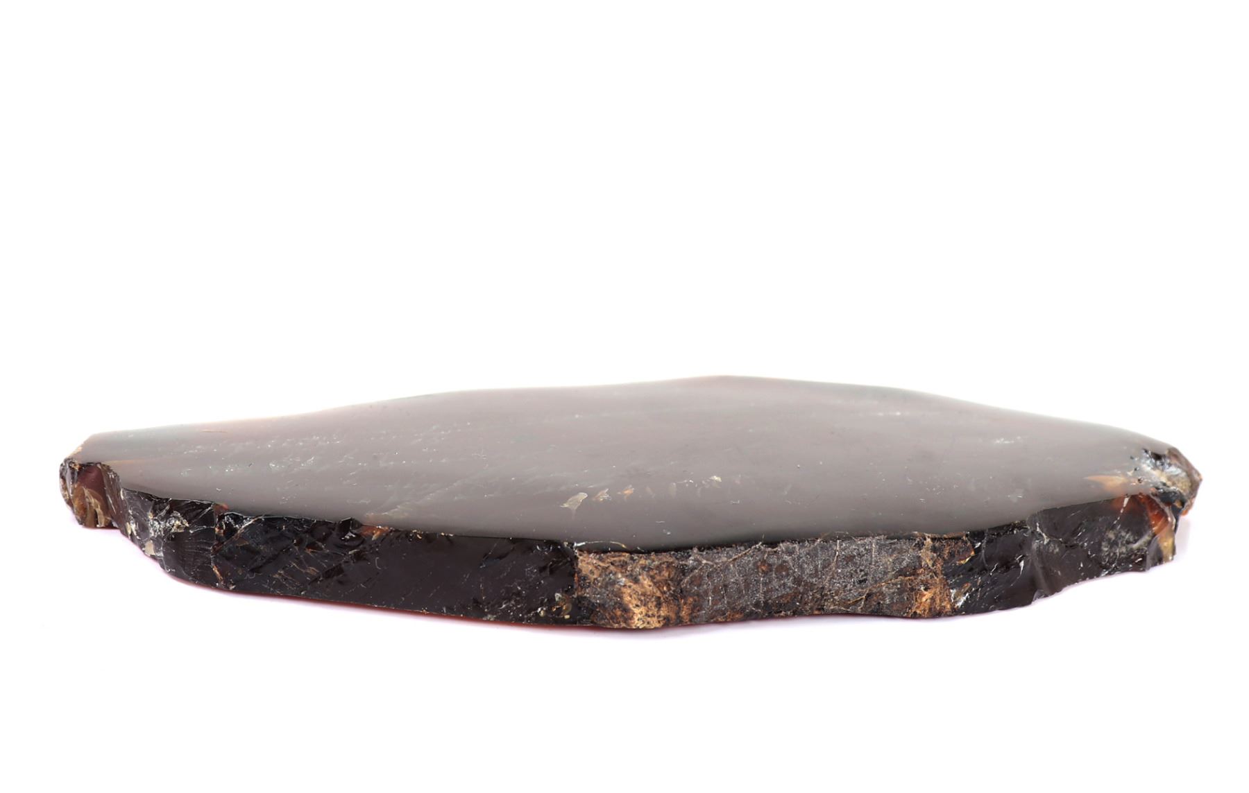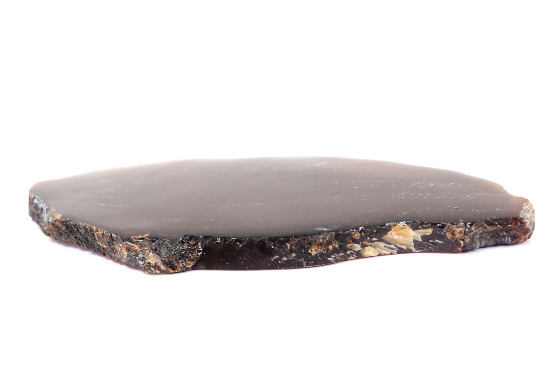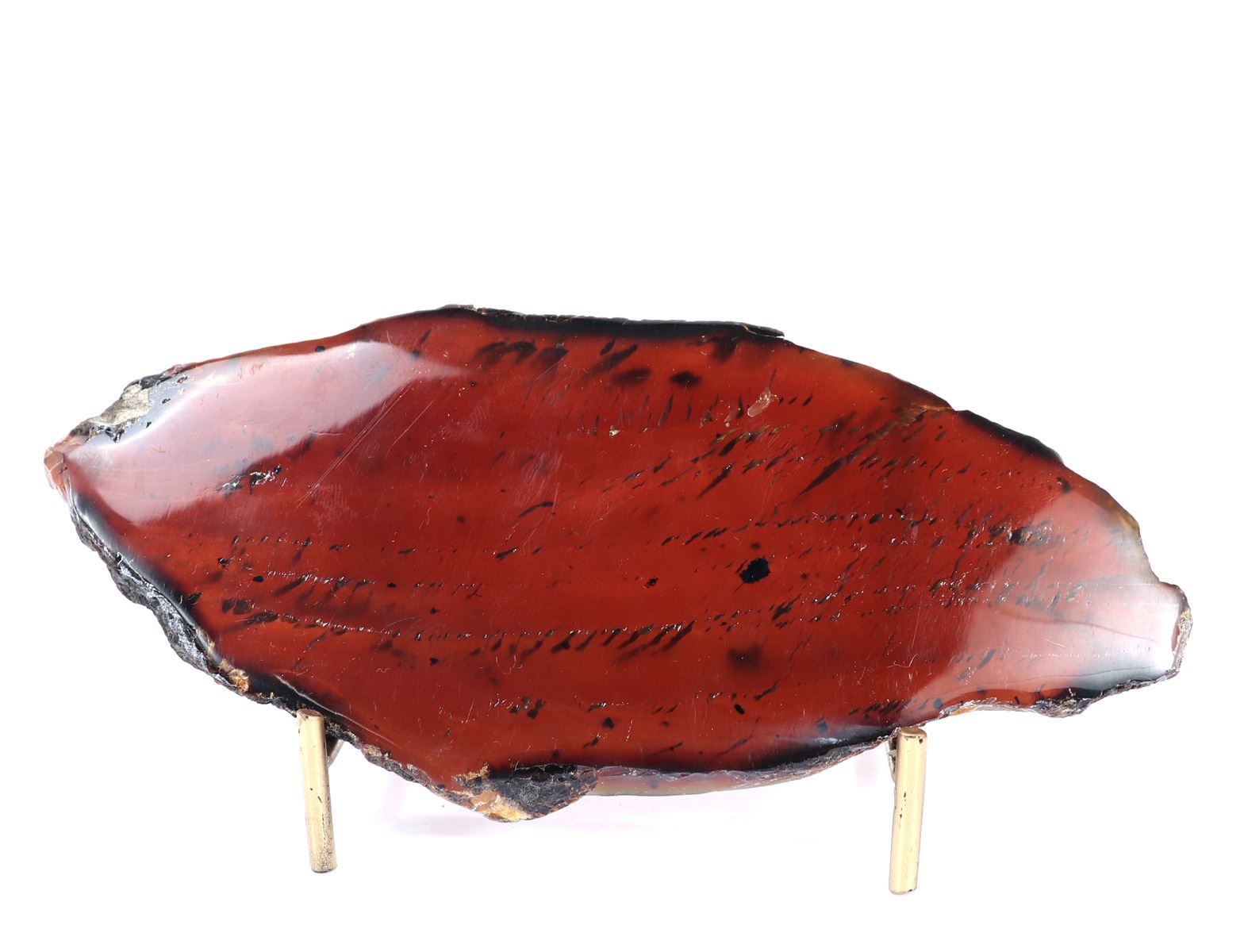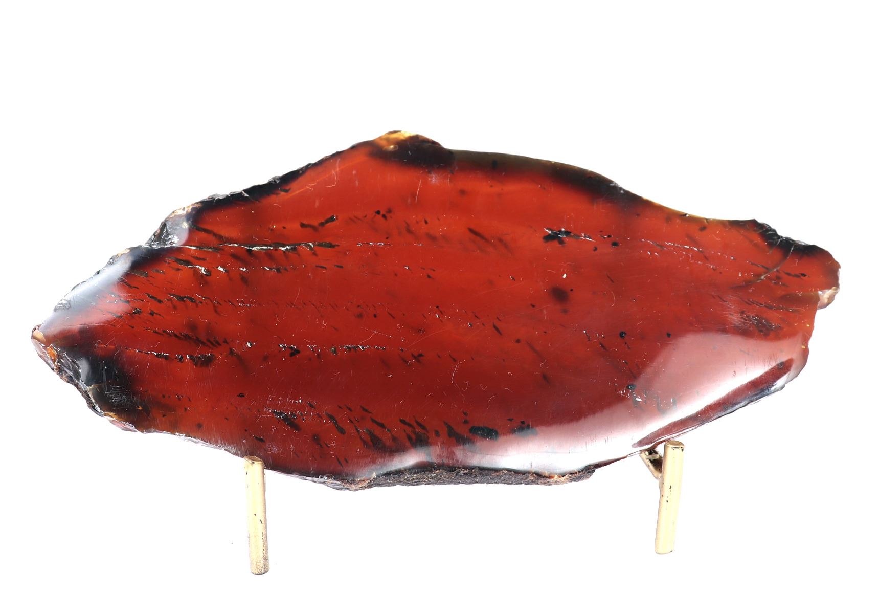 Gorgeous slab section of raw translucent amber on a stand. Beautiful warm caramel amber coloring throughout. Natural inclusions throughout as shown. Size 7" L x 3" W x 1/2" H, weight 105g. Condition: Wonderful overall preserved condition.