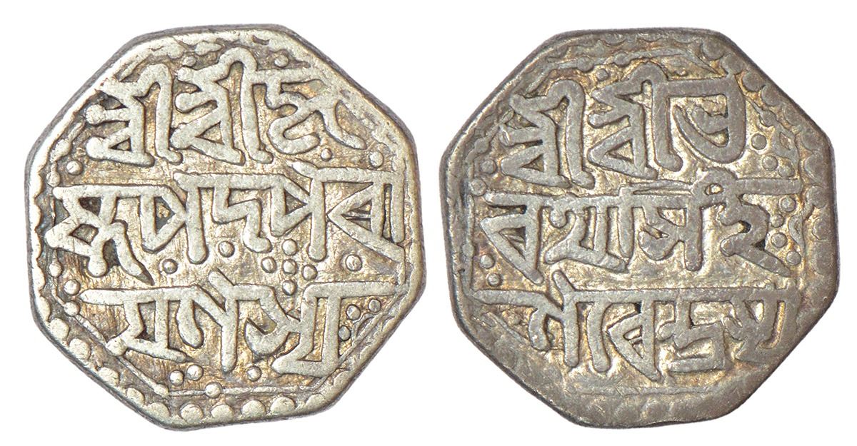 Independent Kingdoms: Assam, Bharatha Simha (1791-1797 AD), Moamaria rebels, silver ½ rupee, ND, R&B W11.1-12.1, 5.60g. Obv: Legend Sri Sri Kri/shna Pada Pa/rayansya. Rev: Legend Sri Sri Bha/ratha Simha Na/rendrasya, both side legend in three lines.