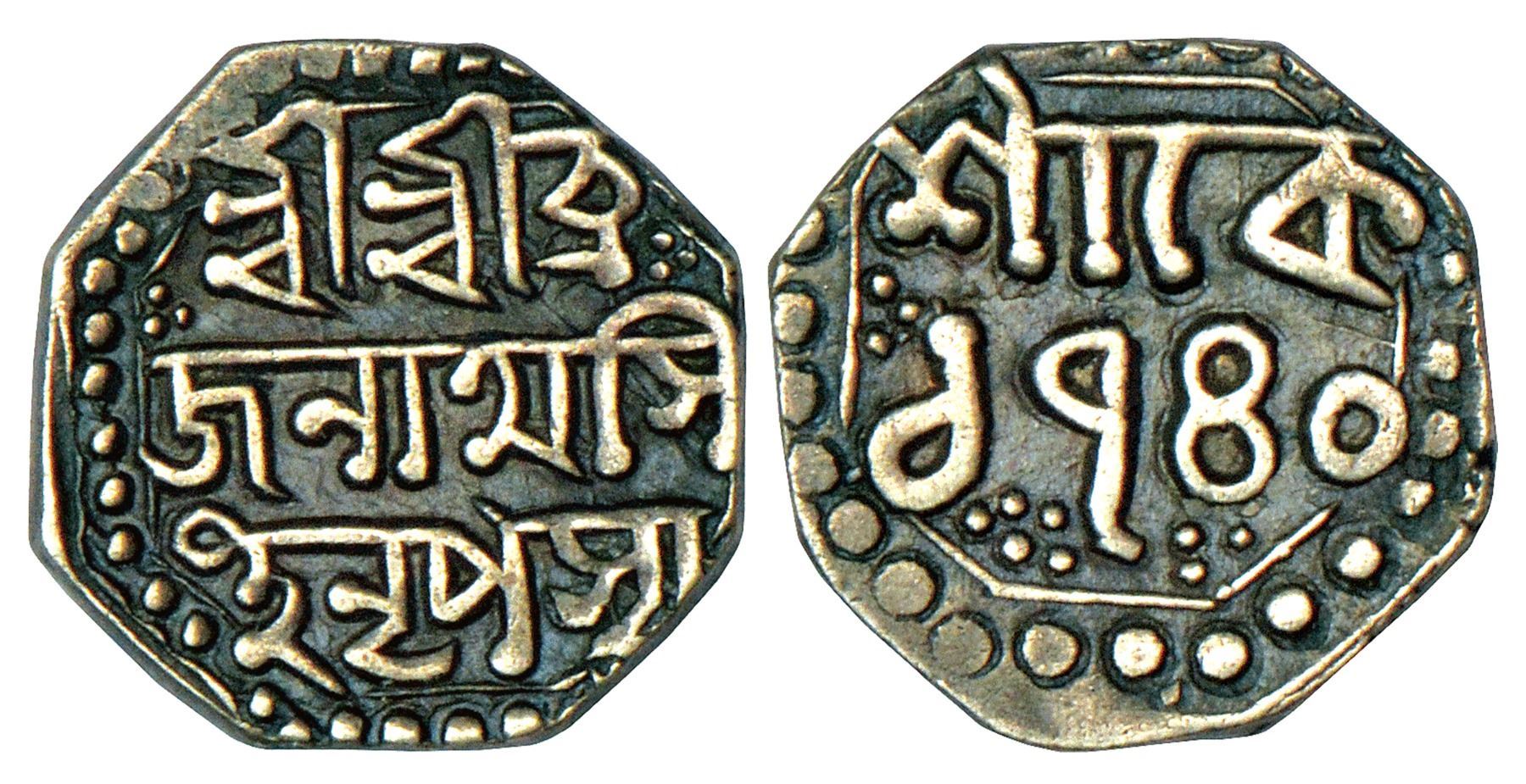 Assam, Brajanatha Simha (1818-1819 AD), silver ¼ rupee, sake 1740, 2.81g. Obv: Legend Sri Sri Bra/janatha Si/mha NrPasya in three lines. Rev: Legend Sake/1740 in two lines, R&B.T13.1.