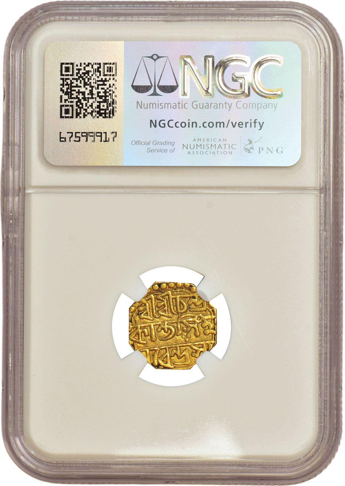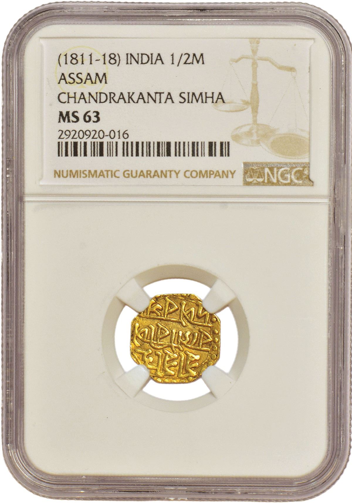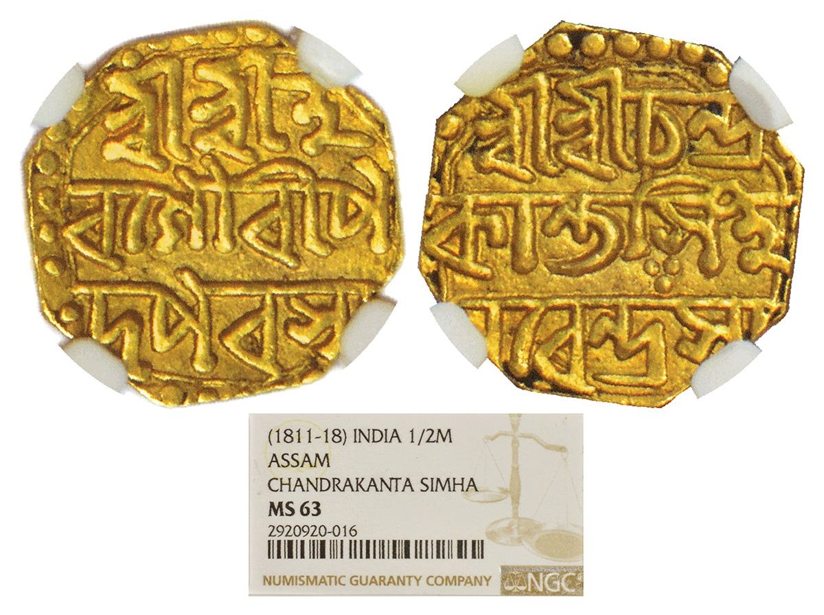 Assam, Chandrakanta Simha (1819-1821 AD), gold ½ mohur, ND. Obv: Legend Sri Sri Hara/Gauri Pa/da Parasya. Rev: Legend Sri Sri Chandra/Kanta Simha/-Narendrasya, both sides legend in three lines, unpublished in any references.