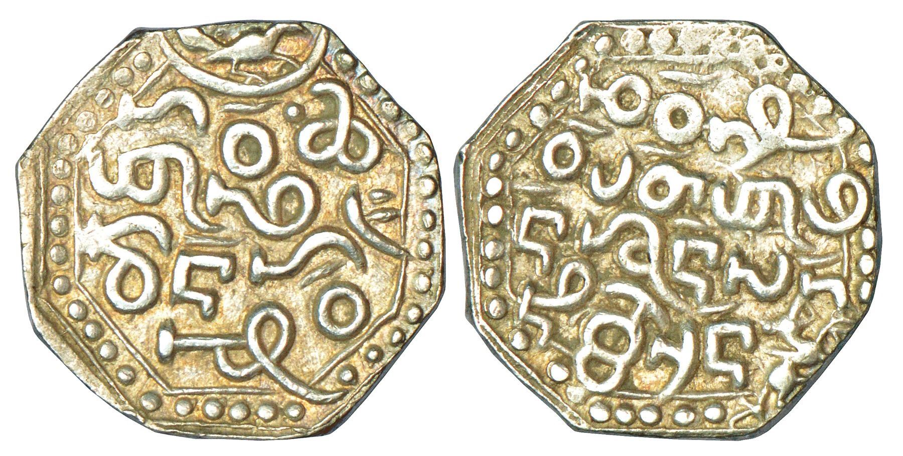 Assam, Gadadhara Simha (1681-1696 AD), silver rupee, ND, 11.28g. Obv: Legend Kao boi/Pha Leng-/don heu/ciu, with a bird in crescent at top, Arc with one dot ESE corner. Rev: Legend Chao Siu-/Pat-Pha Pi/n Khun Lak-/ni Rai-san, with lion lower right, R&B.E7.4.