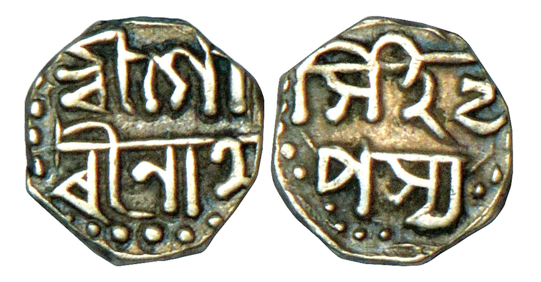 Assam, Gaurinath Simha (1780-1795 AD), silver 1/16 rupee, ND, 0.73g. Obv: Legend Sri Gau/rinatha. Rev: Legend Simha Nr/Pasya, both sides legend in two lines, R&B.R131.1.