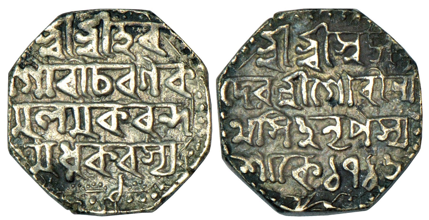 Assam, Gaurinath Simha (1780-1795 AD), silver rupee, sake 1716/RY 1, 11.30g. Obv: Legend Sri Sri Hara/Gauri Charana Ka/mala Makaranda/Madhukarasya, (year) 1 below. Rev: Legend Sri Sri Svarga/Deva Sri Gaurina/tha Simha NrPasya/sake 1716, below lion facing to left, both sides legend in four lines, R&B.R55.1.