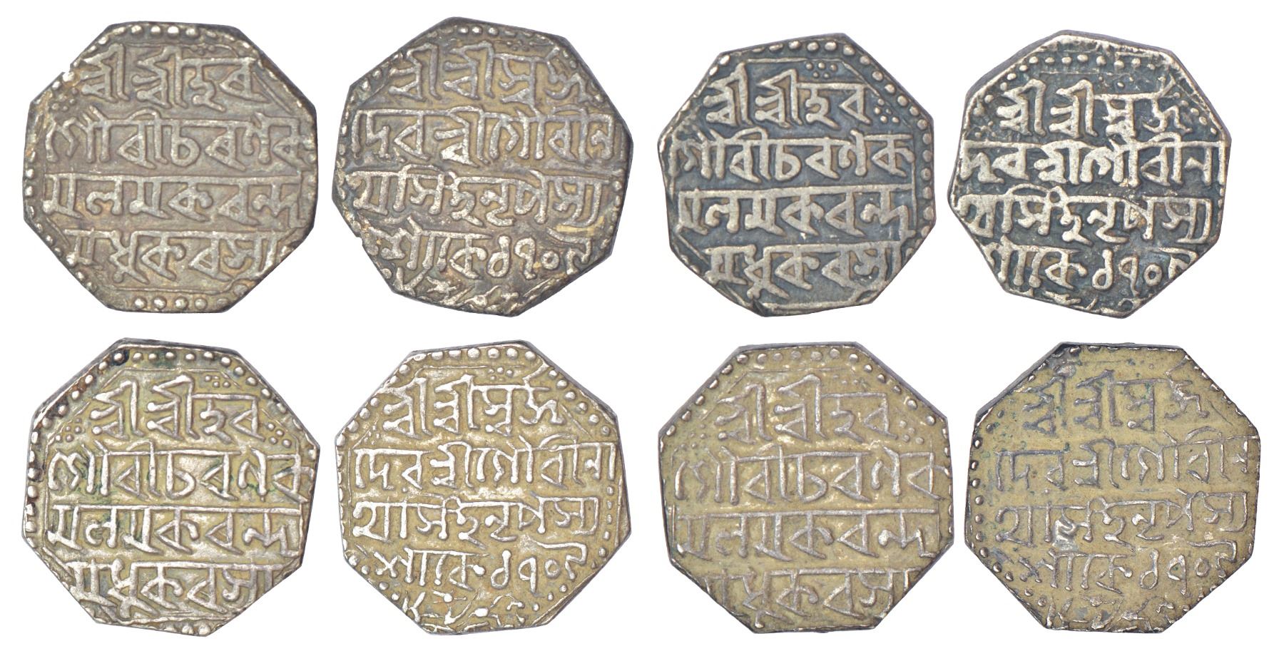 Assam, Gaurinatha Simha (1780-1795 AD), silver rupee (4), Sake 1709/Year 8, R&B R-41.1-41.5, 11.15g, 11.25g, 11.32g and 11.37g. Obv: Legend Sri Sri Hara/Gauri Charana Ka/mala Makaranda/Madhukarasya. Rev: Legend Sri Sri Svarga/Deva Sri Gaurina/tha Simha NrPasya/sake 1709/8, below lion facing to left, both sides legend in four lines. (4 coins)