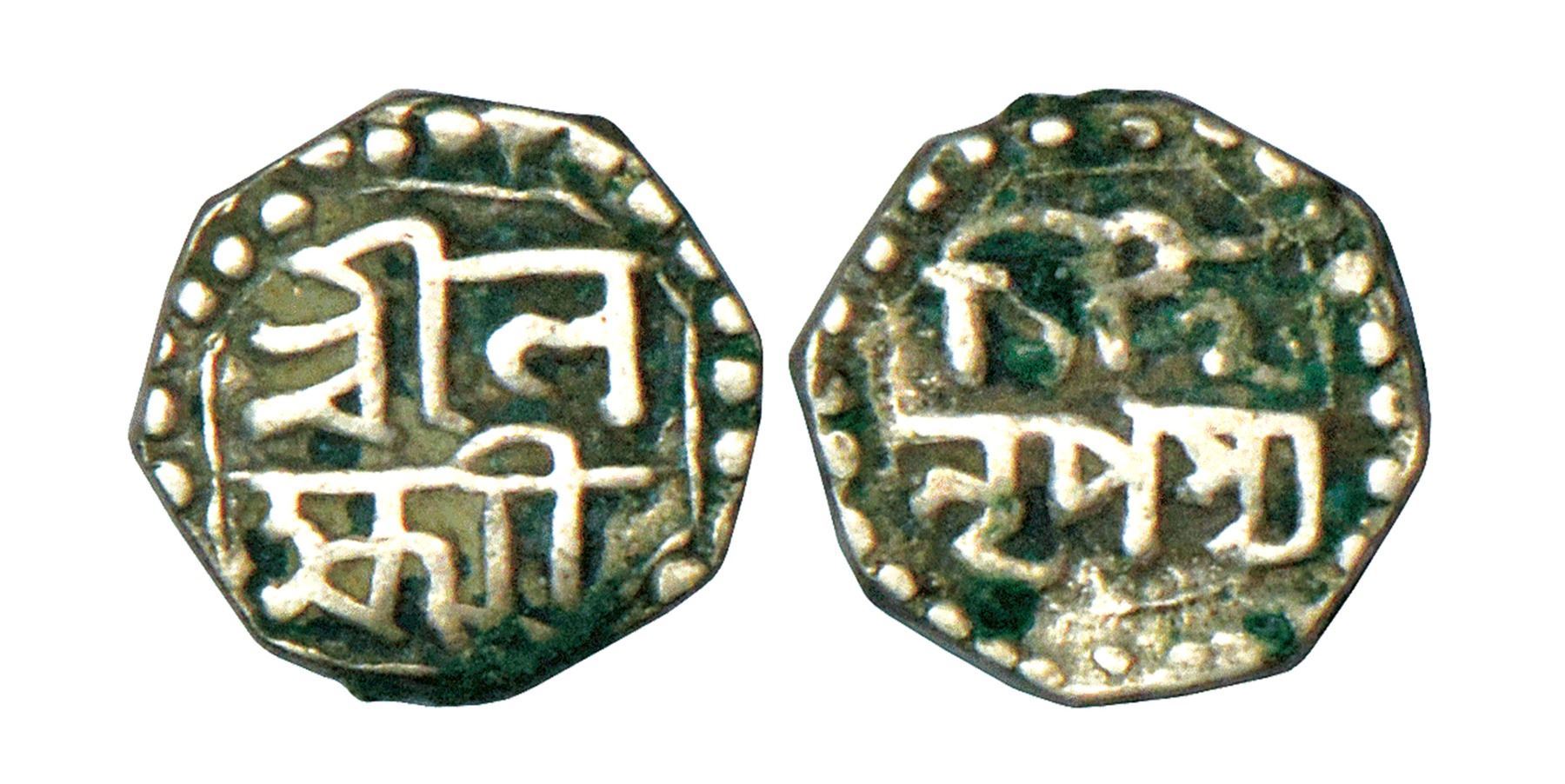 Assam, Lakshmi Simha (1770-1780 AD), silver 1/16 rupee, ND, 0.70g. Obv: Legend Sri La/ksmi in two lines. Rev: Legend Simha/NrPasya in two lines, R&B.Q60.1.