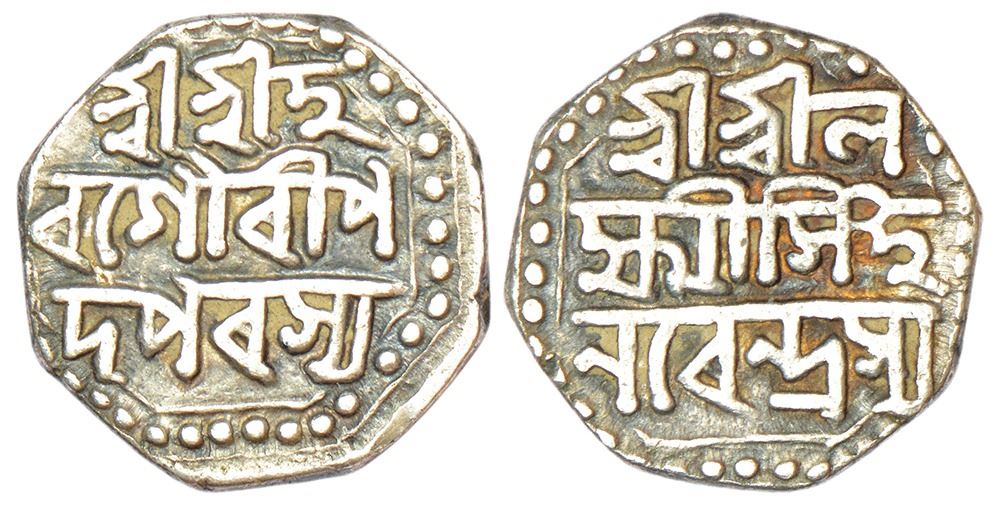 Assam, Lakshmi Simha (1770-1780 AD), silver ½ rupee, ND, R&B Q40.1, 5.58g. Obv: Legend Sri Sri Ha/ra Gauri Pa/da Parasya. Rev: Legend Sri Sri La/ksmi Simha Na/rendrasya, both sides legend in three lines.
