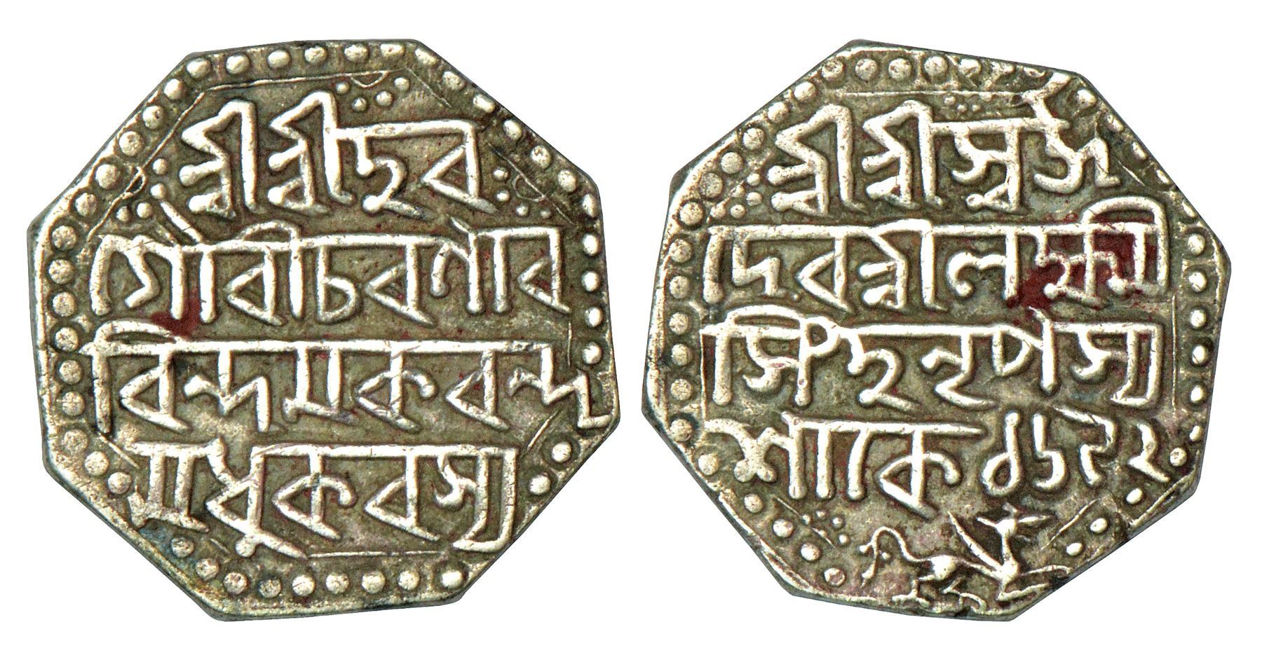 Assam, Lakshmi Simha (1770-1780 AD), silver rupee, Sake 1692, 11.29g. Obv: Legend Sri Sri Hara/Gauri Charana ra/vinda Makaranda/Madhukarasya. Rev: Legend Sri Sri Svarga/Deva Sri Laksmi/Simha NrPasya/sake 1692, below lion facing right, both sides legend in four lines, R&B.Q24.1.