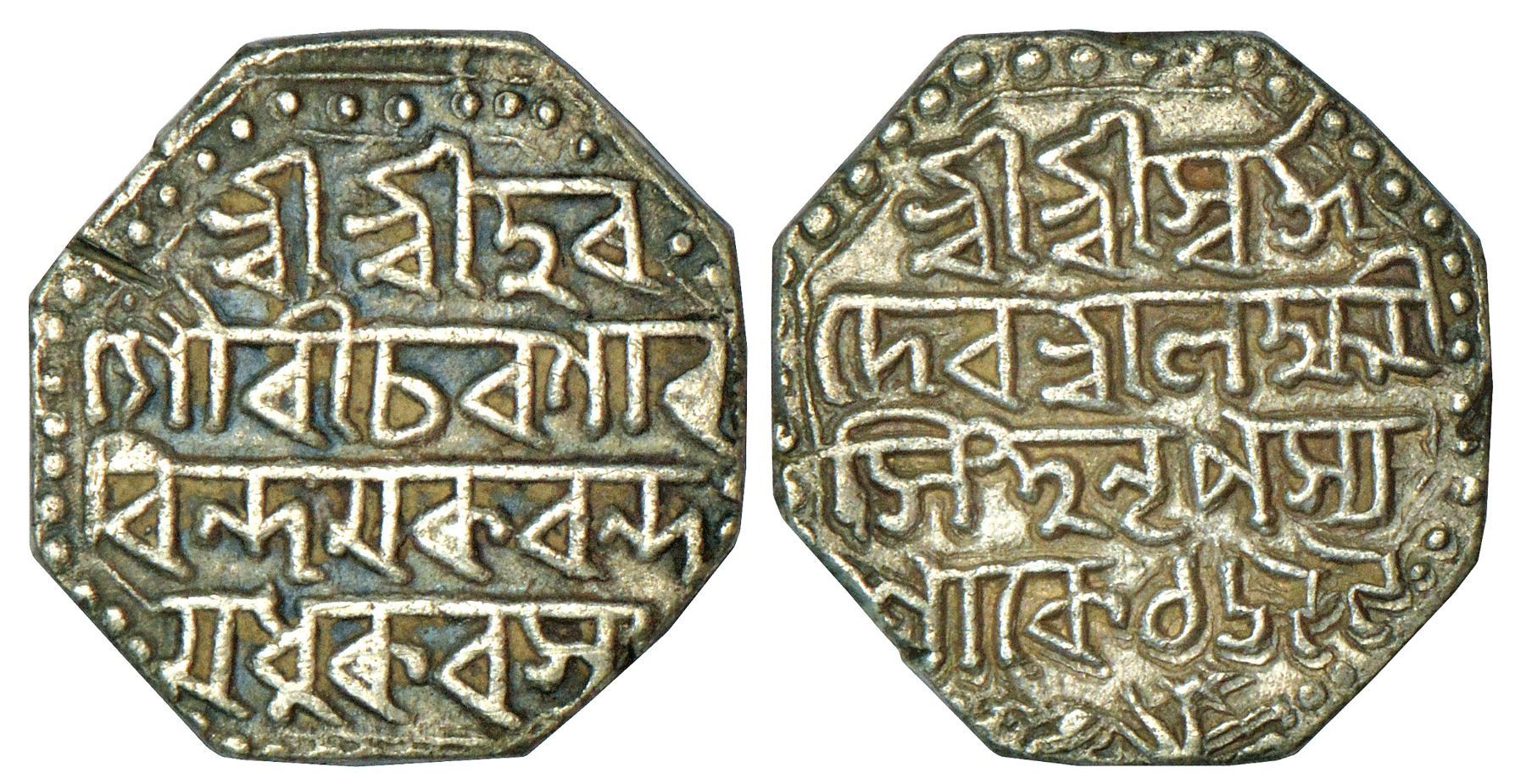 Assam, Lakshmi Simha (1770-1780 AD), silver rupee, sake 1699, 11.18g. Obv: Legend Sri Sri Hara/Gauri Charana/Vinda Makaranda/Madhukarasya. Rev: Legend Sri Sri Svarga/Deva Sri Laksmi/Simha NrPasya/sake 1699, below lion facing to right, both sides legend in four lines, R&B.Q32.1.