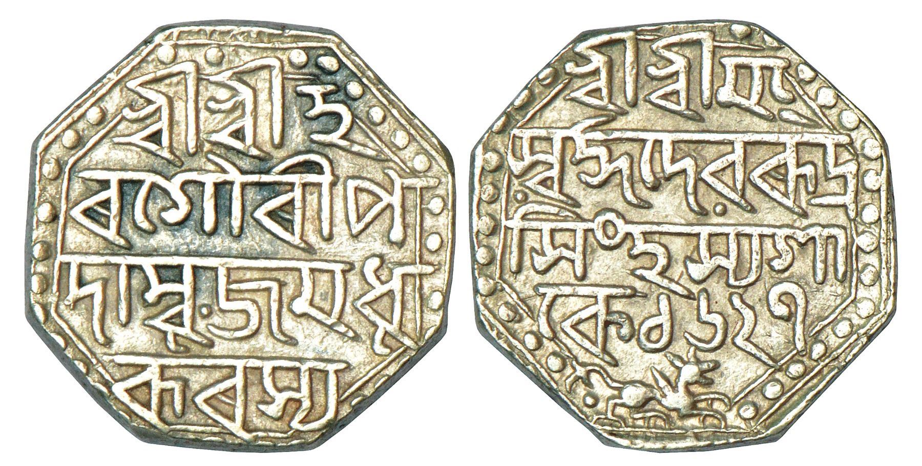 Assam, Rudra Simha (1696-1714 AD), silver rupee, sake 1627, 11.32g. Obv: Legend Sri Sri Ha/ra Gauri Pa/dambuja Madhu/Karasya. Rev: Legend Sri Srimat/Svarga deva-Rudra/Simhasya Sa/ke 1627, below lion facing to right, both sides legend in four lines, R&B.F15.1.