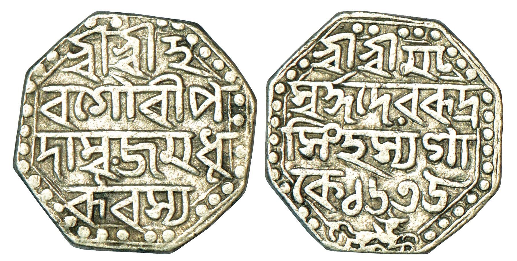 Assam, Rudra Simha (1696-1714 AD), silver rupee, sake 1635, 11.13g. Obv: Legend Sri Sri Ha/ra Gauri Pa/dambuja Madhu/Karasya. Rev: Legend Sri Srimat/Svarga deva Rudra/Simhasya Sa/ke 1635, below lion facing to right, both sides legend in four lines, R&B.F23.1.