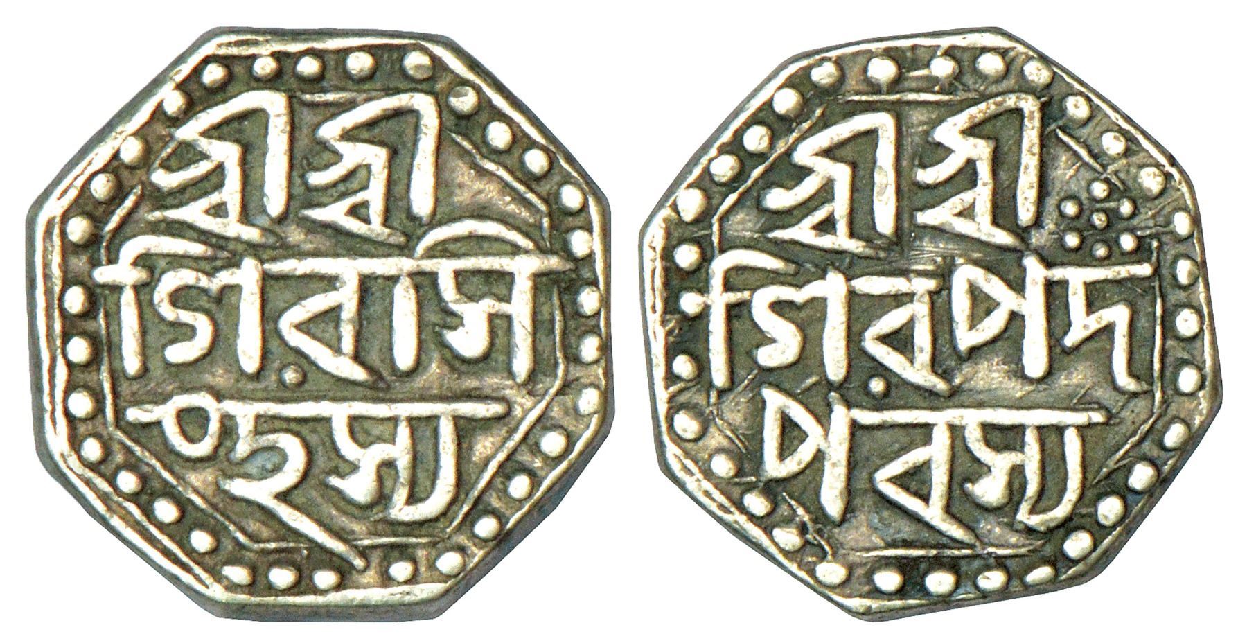 Assam, Siva Simha (1714-1744 AD), silver rupee, without Queen name, ND, 5.65g. Obv: Legend Sri Sri Siva Pada/Parasya. Rev: Legend Sri Sri/Siva Si/mhasya, both sides legend in three lines, R&B.G15.1.