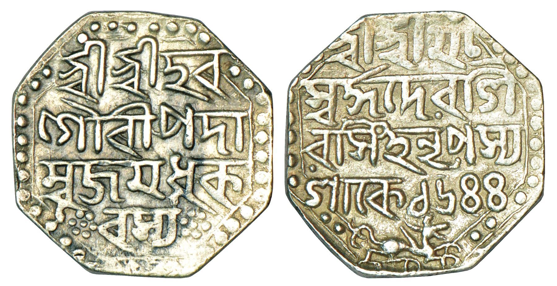 Assam, Siva Simha (1714-1744 AD), silver rupee, without Queen name, sake 1644, 11.21g. Obv: Legend Sri Sri Hara/Gauri Pada/mbuja Madhuka/rasya. Rev: Legend Sri Srimat/Svarga deva Si/va Simha Napasya/sake 1644, below lion facing to right, both sides legend in four lines, R&B.G12.2.