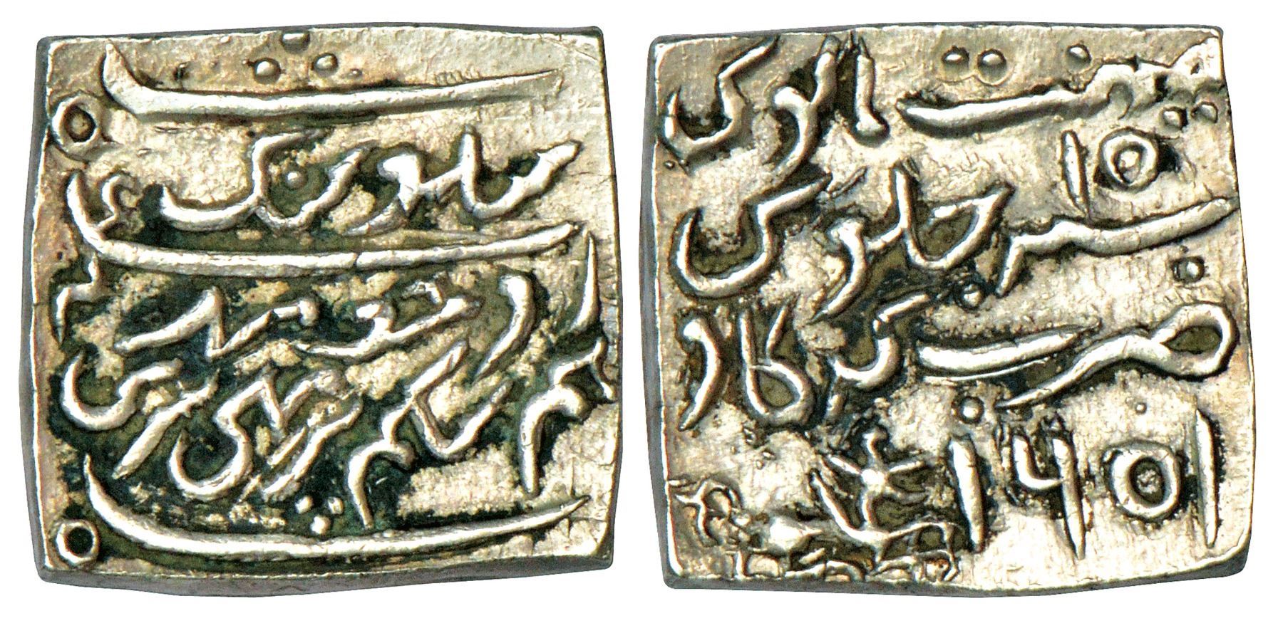 Assam, Siva Simha (1714-1744 AD), silver square rupee, with citing Queen Pramathesvari, Gargaon mint, sake 1651/RY 15, 11.40g. Obv: Persian legend Shah/Siva Singh/Sikkah/Zad chu mehr/Bahm Begam Pramathesvari/Shah. Rev: Persian legend Maimanut Manus/Sanah 15 Jalus/Zarb Gargaon 1651, lion facing to right, R&B.I14.1.