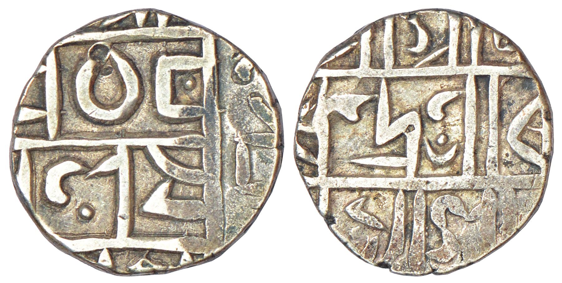 Cooch Behar, Harendra Narayan (1783-1839 AD), silver ½ tanka, ND, Bose KK-M1.1-1.11, 4.57g. Obv: Legend Sri Sri/ Siva charana /kamala madhu/ Karasya. Rev: Legend Sri Srima/t Dharendra or Harendra Nara/yanasya Sake.