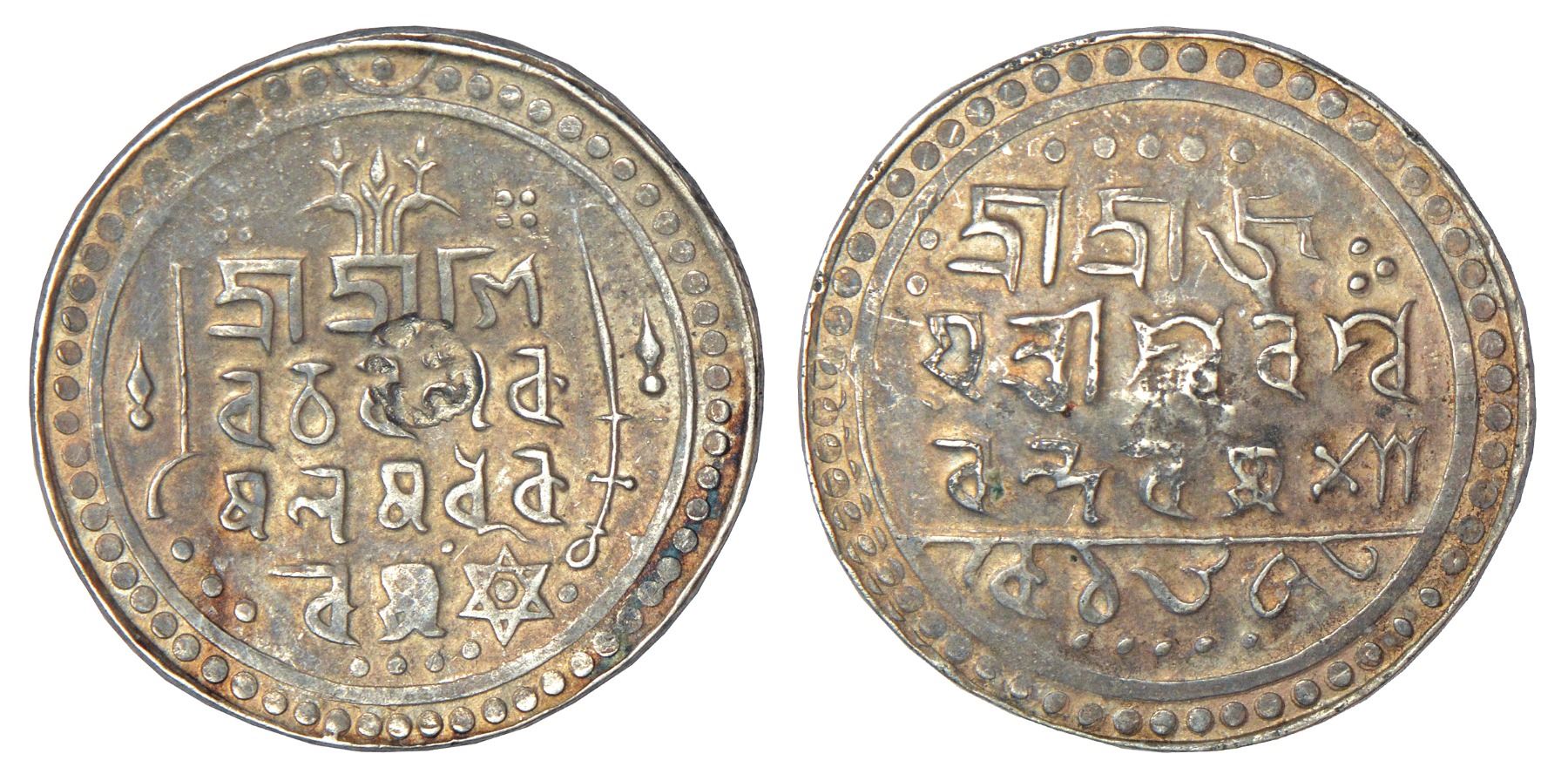 Jaintiapur, Bargosain II (1731-1770 AD), silver tanka, SK 1653, 9.45g. Obv: Legend Śri Śri Śi/va Charana ka/mala Madhu Ka/rasya (star), pistol in left margin, sword to right. Rev: Legend Śri Śri Ja/yantipura Pu/randarasya Śa/ke 1653, two beads at start of top line and three at end, a row of five beads top and bottom, all within a circular beaded border, R&B-J. K13; KM 177, test mark in center on obverse.