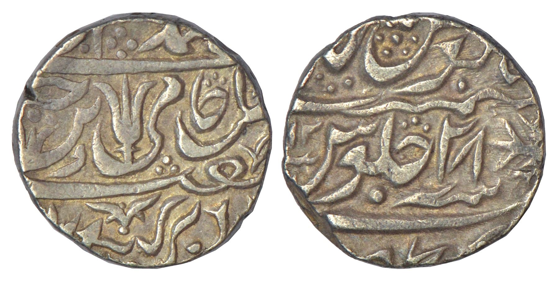 Maratha Confederacy, domains of the Kher family, silver rupee, in the name of Shah Alam II, Srinagar mint, AH 12xx/RY 28, trident and boat like symbol on obverse, M&W T1, 11.01g.