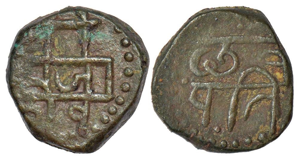Maratha Confederacy, 'Swarajya' phase - copper paisa/10-cash in the name of Chhatrapati Shivaji, similar to Ganesh Tamilnadu 11.6 (attributed to Gingee), 11.25g. Obv: Devanagari legend Shri/Raja/Shiva in three lines. Rev: Devanagari legend Chhatra/pati in two lines.