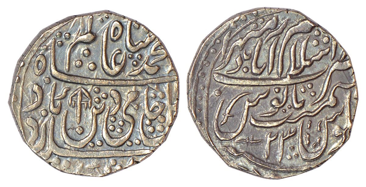 Independent Kingdoms: Maratha Confederacy, silver rupee, Islamabad Mathura mint, in the name of Shah Alam II, RY 23, Chhatra mint-mark on obverse and sword mint-mark on reverse, similar to M&W T1, 11.26g.