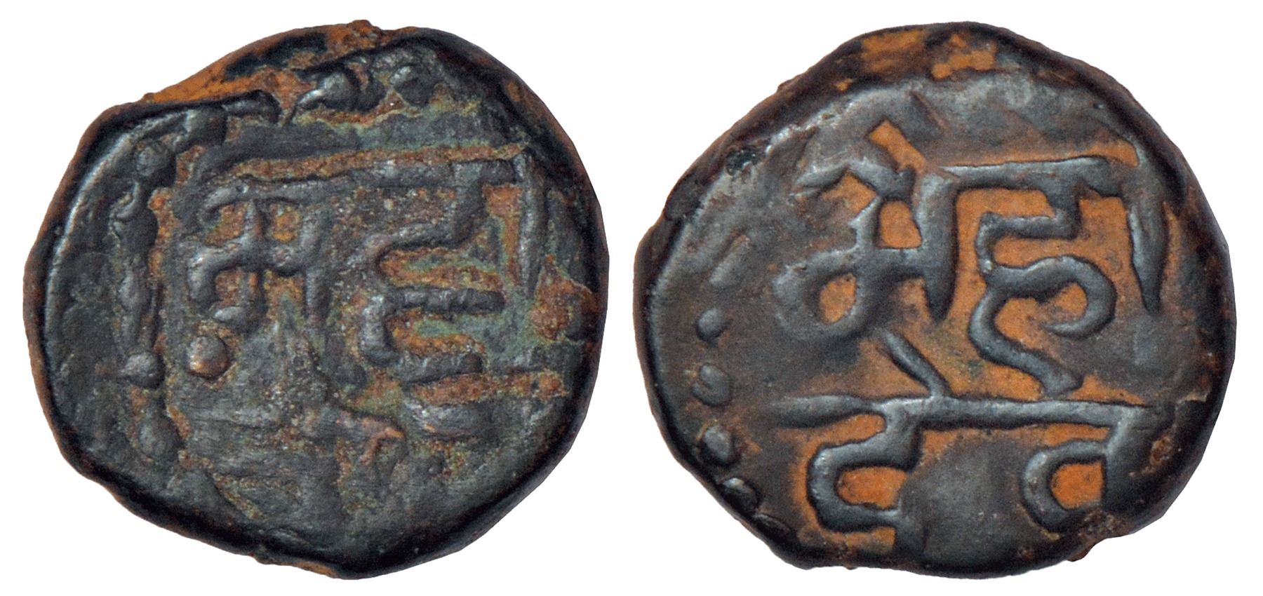 Marathas of Tanjore (Thanjavur), anonymous copper cash (1674-1799 AD), in the name of 'Maharaja', MCSI-II 785-786, 3.04g. Obv: Devanagri legend Maharaja in two line. Rev: Devanagri legend Mahadev in two line.