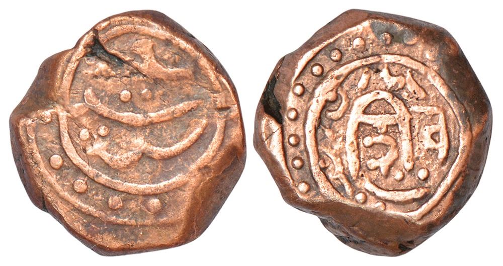 Marathas of Thanjavur - copper paisa /10-cash, struck in late 17th century, not published in major sources, 11.37g. Obv: crude Farsi inscription Alamgir within a double circular border. Rev: Devanagari legend Shiva, surrounded by small floral decorations within a double circular border.