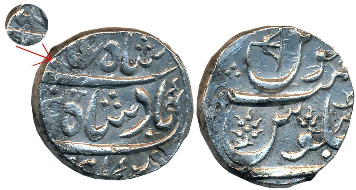 Nashik- Gulshanabad, Silver Rupee, 11.25g, in the name of Shah Alam II, AH 11(8)2, Obv: Parshu (Battle-Axe) symbol below the “Gha” of Ghazi, Rev: Bow & Arrow in “Sa” of Julus and other 2 symbols. Combination of Battle-Axe & Bow & Arrow symbol not listed in M&W. Cleaned, extremely fine for type, extremely rare.
