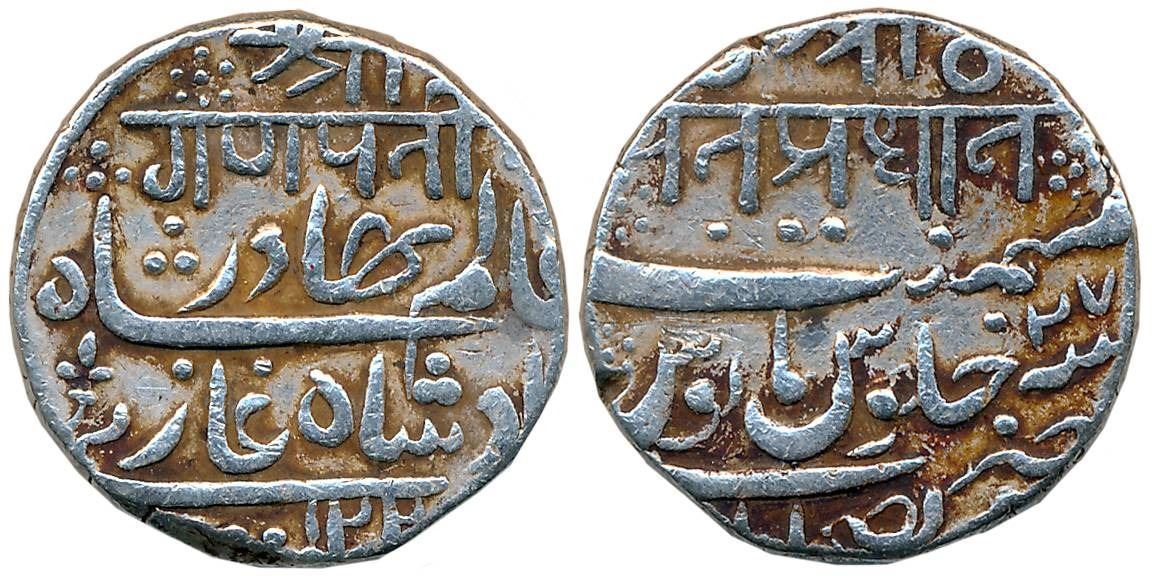 Miraj- Murtazabad, Silver Rupee, 11.33g, “Sri Ganapati/ Sri Pantpradhan”, in the name of Shah Alam, FE 122X/ RY 27, Obv: Devanagari legend “Shri Ganapati” above Persian legend, date below, Rev: Devanagari legend “Sri Pantapradhan” above usual Maimanat Manus formula, Mint name Murtazabad below (M&W# T2, KM# 332). Extremely rare to get full date and Mint name. Very fine+, exceedingly rare.