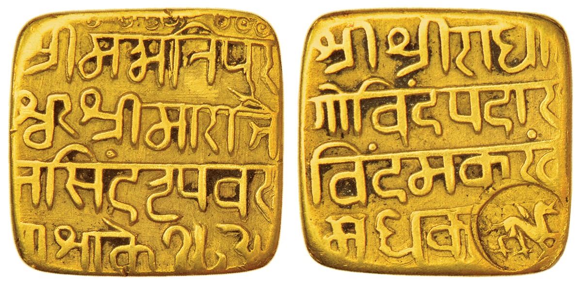 Modern fantasy in gold of Manipur, Marjit Simha (1812-1819 AD), tanka, dated 1741, R&B 'Manipur' F5, 11.05g. Obv: Nagari legend Shri Manmanipureshwar Shri Marjit Simha Nrupawarasya Shake followed by date. Rev: Nagari legend Shri Shri Radha Govinda Padaravinda Makaranda Madhukarasya; countermarked with a 'winged lion' motif.