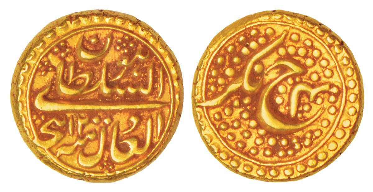 Independent Kingdoms: Mysore, Tipu Sultan (1782-1799 AD), gold pagoda, Nagar mint, AH 1200/RY 4, KM 109, 3.43g. Obv: Persian legend huwa al-sultan al-adil Hijri with AH date. Rev: Persian 'He' with mint-name and RY within granulated field.