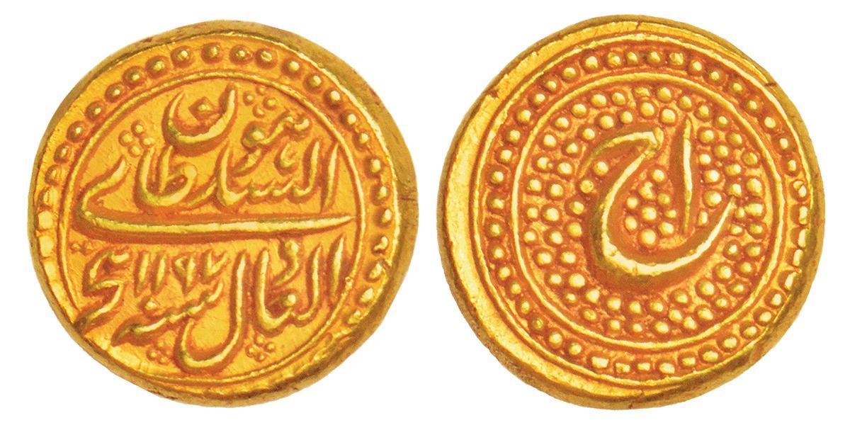Independent Kingdoms: Mysore, Tipu Sultan (1782-1799 AD), gold pagoda, Pattan mint, AH 1197/RY 1, Persian He on reverse, KM 129, 3.43g. Obv: Persian legend huwa al-sultan al-adil Hijri with AH date. Rev: Persian 'He' and RY within granulated field.