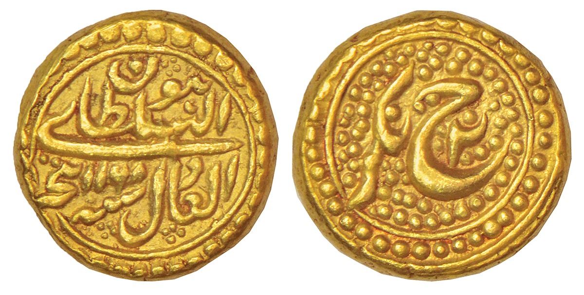 Mysore, Tipu Sultan (1782-1799 AD), gold sultani (pagoda), Nagar mint, AH 1198/RY 2, full mint-name and Persian 'He’ on reverse, KM 109, 3.40g.