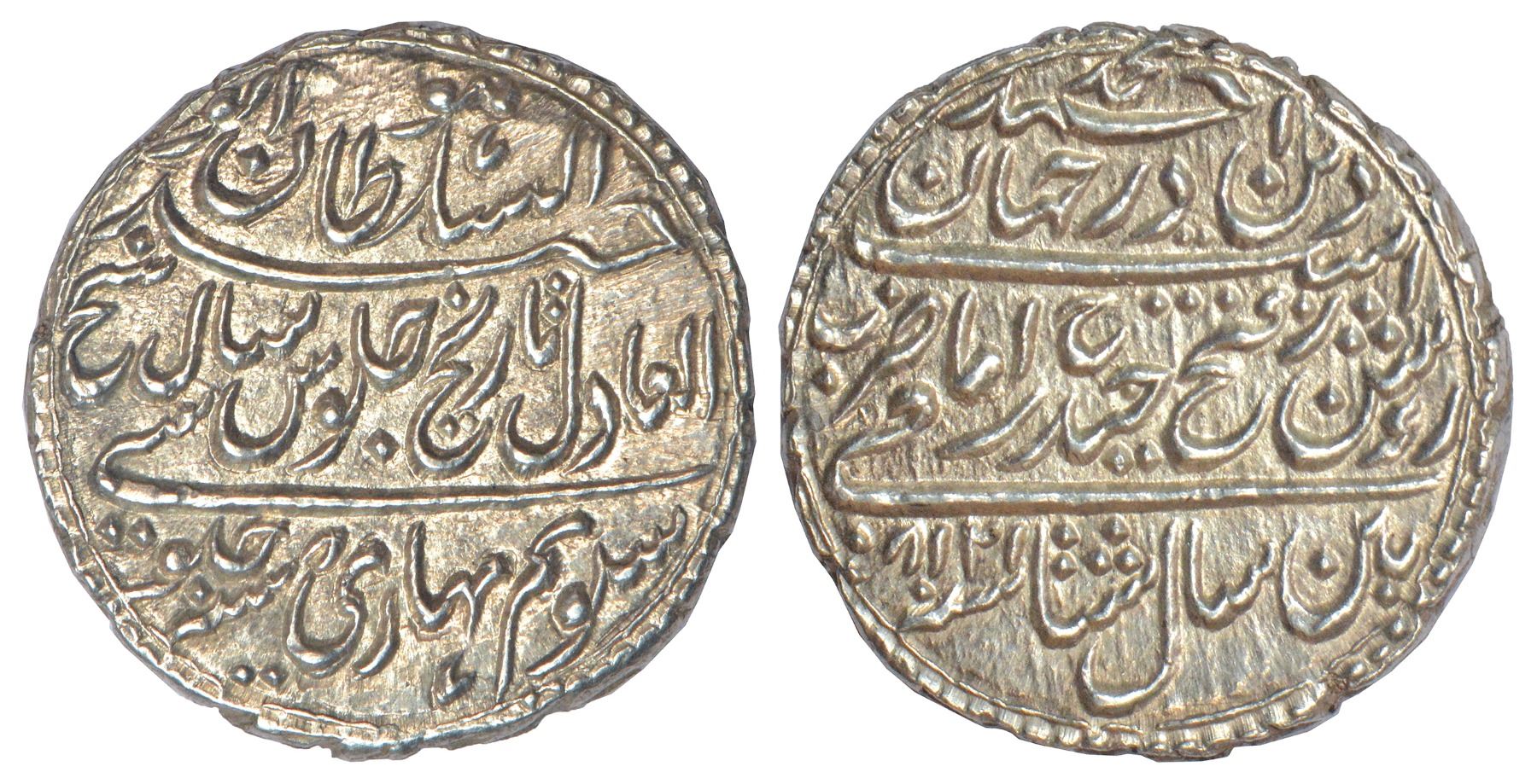 Mysore, Tipu Sultan (1782-1799 AD), silver rupee or 'Imami', Pattan mint, dated Mauludi year 1218, 'Shita' / RY 8 'Sakh', KM 126, 11.36g. Obv: Farsi legend Huw al-Sultan al-Wahid al-Adil Tarikh Jalus Sakh sueem Bahari Sanah 8 Julusi. Rev: Farsi legend Muhammad Ahmad Deen dar Jahan Ast Roshan za Fateh Haidar Imami zarb Pattan Sal Shita sanah 1218.