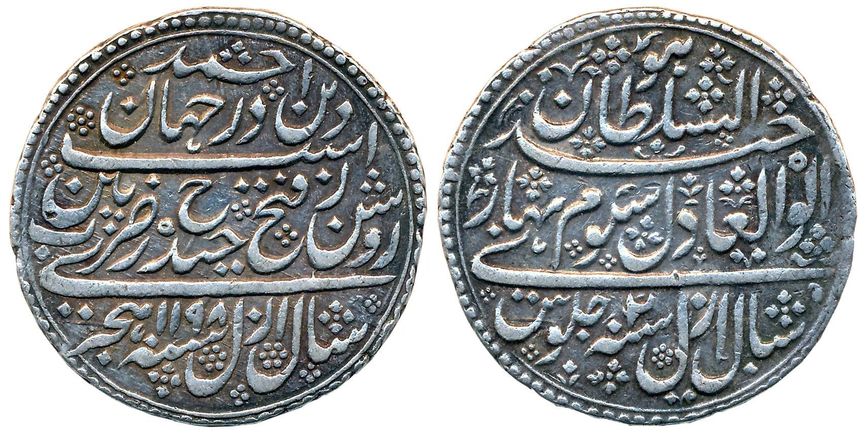 Tipu Sultan, Silver Double Rupee, 22.94g, Patan Mint, AM 1198 Azal / RY 2 Azal (with reworked digit 2 of RY 1), Obv: Persian legend “Ahmad din dar Jahn Ast Raushan ze fatah haidar he zarb Pattan saal i azal sanah 1198 hijri”, Rev: Persian legend “Huwa as sultan al waheed al adil seum bahari saal azal sanah 2 julus” (KM# 127). Beautiful rossets on both sides. Extremely fine, extremely rare.
