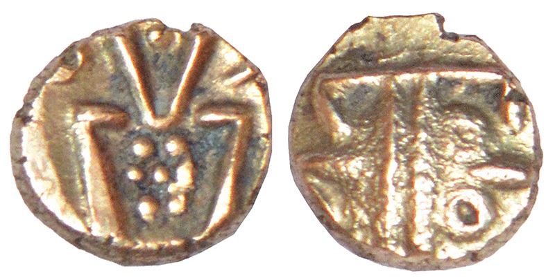 Independent Kingdoms: Nawab of Arcot, gold fanam, 0.34g. Obv: Kali with crescent to the left. Rev: Persian word 'wala'.