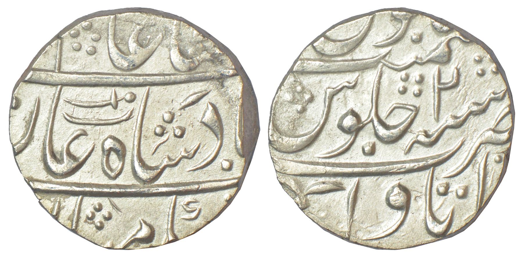 Rohilla Chieftaincies, domains of Inayat Khan, son of Hafiz Rahmat Khan, silver rupee, Itawa mint (fully visible), in the name of Shah Alam II, RY 2, with a 'be/pe/te'-class letter below the usual mark of scimitar on obverse, 11.13g.