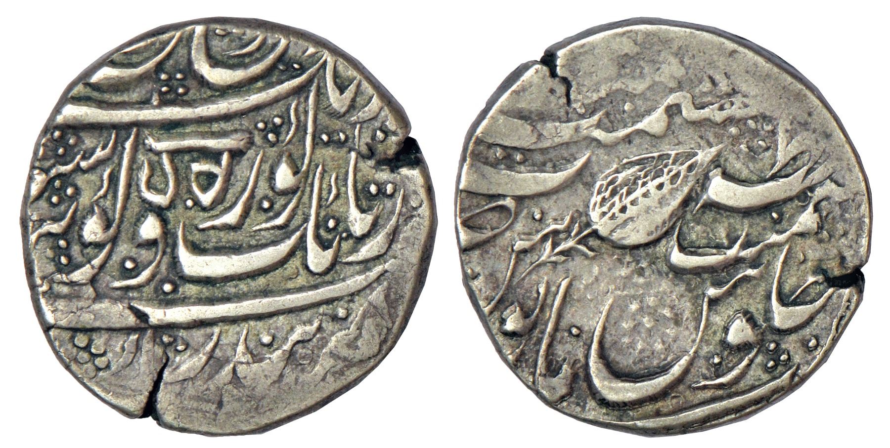 Sikh Empire, Governor Hari Singh Nalwa (1820-1821 AD), silver rupee, Khitta Kashmir mint, 'Gobind Shahi' couplet, date off flan (1878-1879), Gurumukhi 'HAR' for Hari Singh Nalwa on obverse and leaf mintmark on reverse, Herrli 06.05.04, 11.00g.