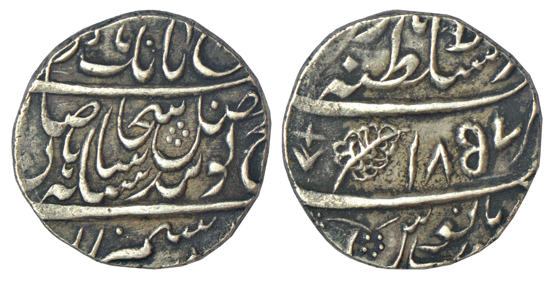 Sikh Empire, Maharajas of Lahore (1799-1846 AD), silver rupee, Dar us-Sultanate Lahore mint, 'Nanak Shahi' couplet, VS 1857, leaf to left on date on reverse, Herrli 08.06.04, 11.12g.