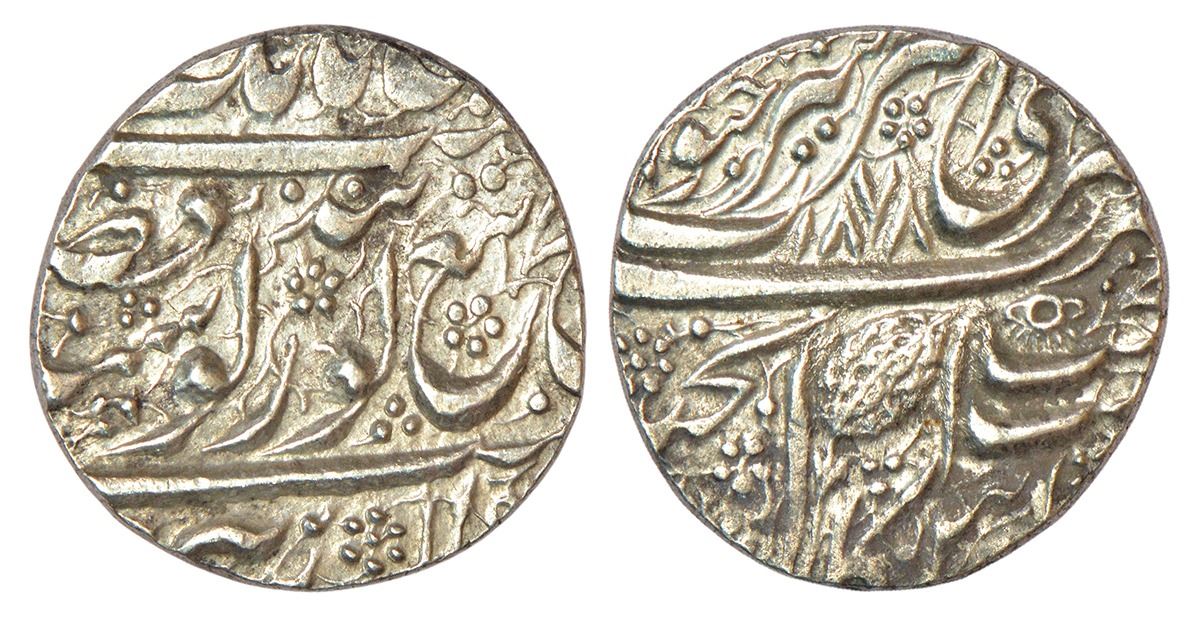 Independent Kingdoms: Sikh Empire, Ranjit Singh (1799-1839 AD), silver rupee, Amritsar mint, 'Nanak Shahi' couplet, VS 1878, star-like aarsi symbol within 'Gur Gobind' on obverse and face-like symbol above 'takht' on reverse, G. Singh 01.39.01, 11.11g.