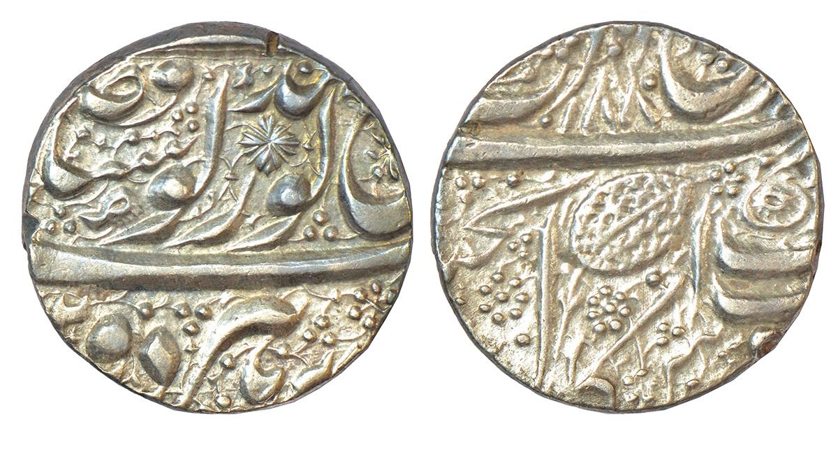 Independent Kingdoms: Sikh Empire, Ranjit Singh (1799-1839 AD), silver rupee, Amritsar mint, VS 1880, Herrli 01.07.04, 11.04g. Obv: 'Nanakshahi' couplet, version V; rosette of five tufts between 'Guru' and 'Gobind', comb (kanghi) symbol below 'Singh'. Rev: 'Julus' formula with Ber leaf symbol; chakkar (Sikh weapon) symbol in crescent to right. (From the collection of Mr. I.K. Kejriwal)