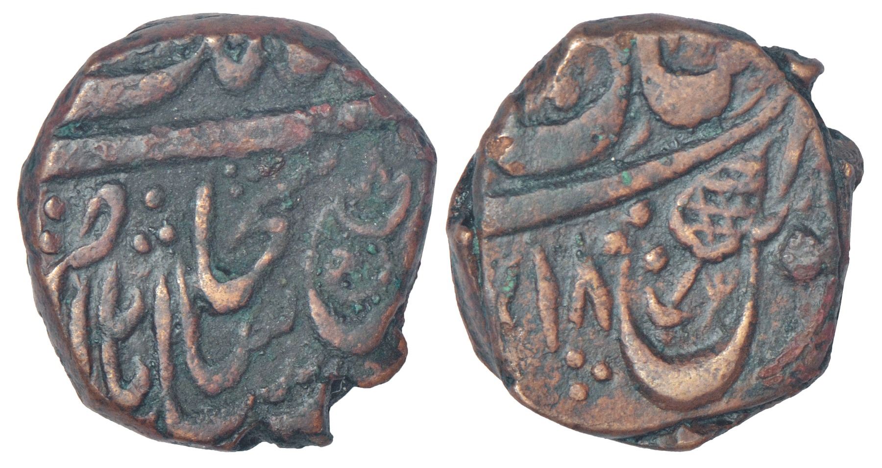 Sikh Empire - copper falus, Multan mint, VS 1880, Herrli 11.08.11, without flower on obverse, VS date to the left of leaf symbol on reverse, 12.42g.