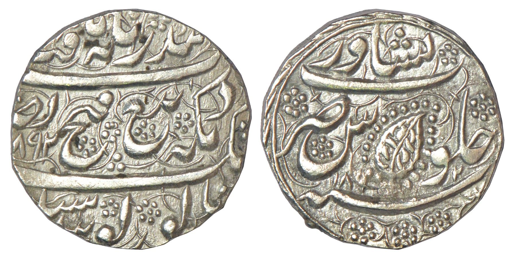 Sikh Empire, silver rupee, Peshawar mint, VS 1892 on both sides, Herrli 13.02.04, 8.43g. Obv: Gobind Shahi couplet. Rev: Dotted border around the leaf, mint name at top. Peshawar rupee were struck in continuation of the last Afghan rupee.