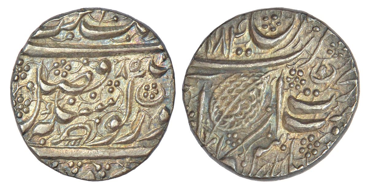 Independent Kingdoms: Sikh Empire - silver rupee of Duleep Singh (1843-1849 AD), Amritsar mint, fixed date VS 1884/moving date VS '85', Herrli 01.10.04, 11.15g. Obv: 'Nanakshahi' couplet, version V; crescent with rosette between 'Guru' and 'Gobind'; comb (kanghi) symbol below 'Singh'. Rev: 'Julus' formula with Ber leaf symbol, crescent with cluster of dots to right. (From the collection of Mr. I.K. Kejriwal)